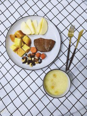 今日小学生早餐:南瓜小米粥,南瓜吐司块,煎牛排,水煮胡萝卜,每日坚果,苹果。002017-11-28 11:02