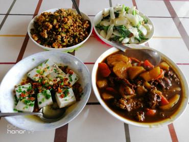 今天的午餐,咖喱牛肉,嫩萝卜,酸豆角肉末,盐水豆腐。002017-10-21 12:07