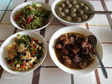 今天的午餐,牛肉丸,糖醋排骨,芹菜炒牛肉,辣椒炒鸡蛋。002017-09-22 12:32