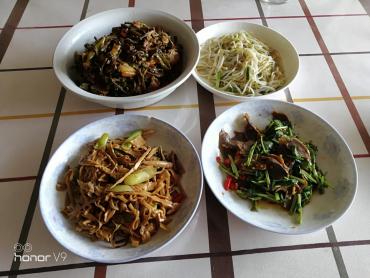 今天的午餐,五花肉炒干豆角,豆芽菜,凉拌鸭庆,五花肉炒笋干。002017-07-20 13:00