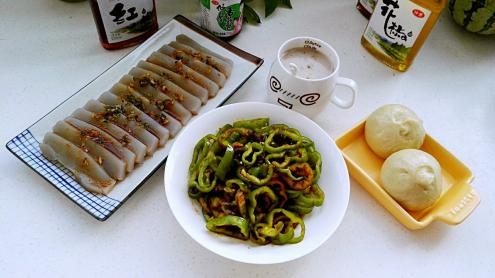 #无华家的粗茶淡饭# 早餐:蒜泥凉粉、香菇酱拌辣椒圈、包子、地锅馍、铁棍山药红豆薏...002017-07-13 16:15