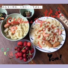 #细蚊家的早餐#大虾肠仔通心粉,混合坚果,樱桃[太阳][太阳]002017-06-01 08:12