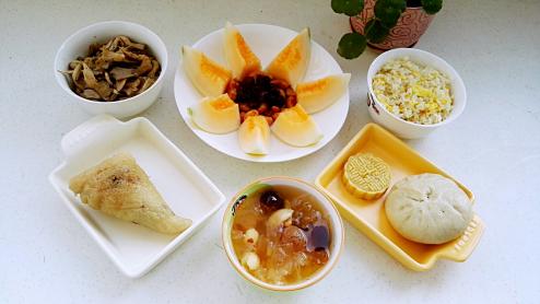 早餐:甜瓜、盐焗腰果、美国整粒蔓越莓、绿豆糕、杂粮蜜枣粽、素包子、蛋炒饭、孜然小...002017-05-28 13:12