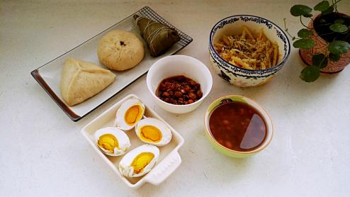 #无华家的粗茶淡饭# 早餐:糖三角、素包子、馒头、杂粮蜜枣粽、凉拌土豆丝、咸鸭蛋、...002017-05-29 07:47