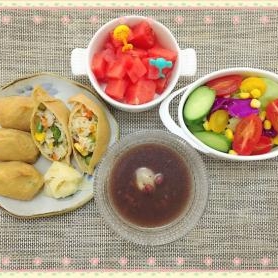 #早餐# 稲荷饭包(一种醋米饭一种蔬菜拌饭)、冰糖红豆汤、蔬菜沙拉、西瓜002017-04-14 08:33