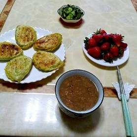 韭菜盒子,草莓,冰糖绿豆粥,黄瓜咸菜。002017-04-11 13:59