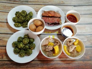 莲藕玉米排骨汤+玉米面菠菜菜团+五香茶鸡蛋+烤红薯002018-11-28 20:33