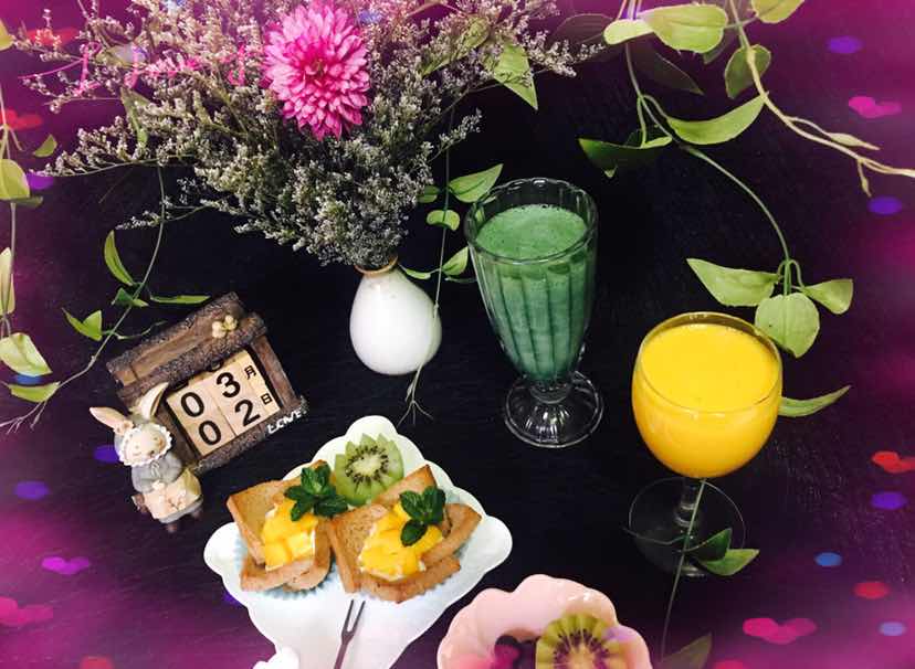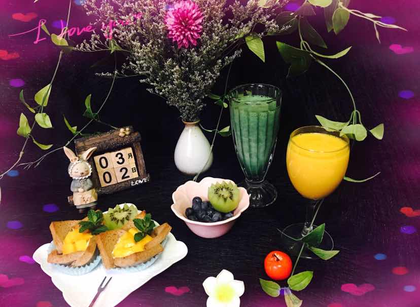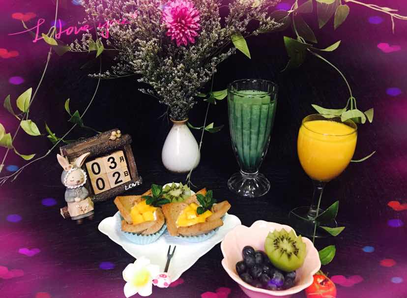今日早餐:橙汁、蓝莓、芒果、猕猴桃、“绿拿铁”精力汤、酸奶全麦吐司盅。