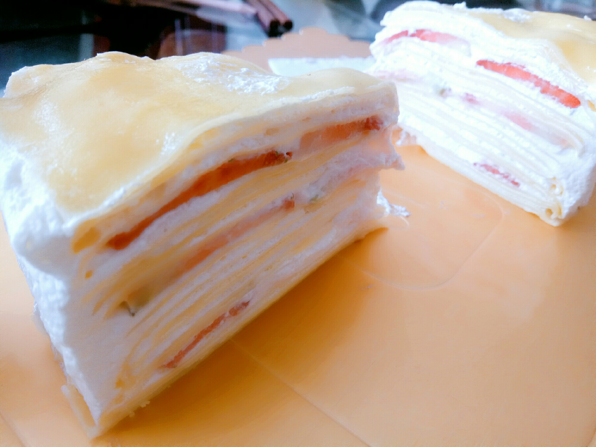 过生日给自己做的千层蛋糕,哈哈,奶油打过了