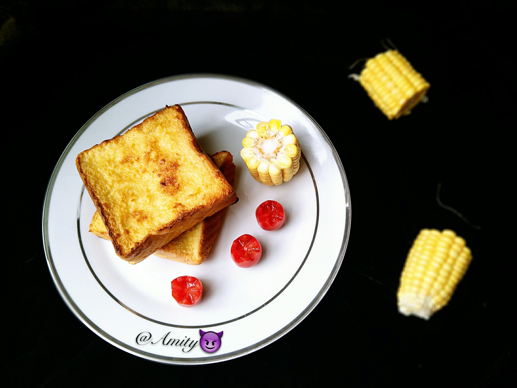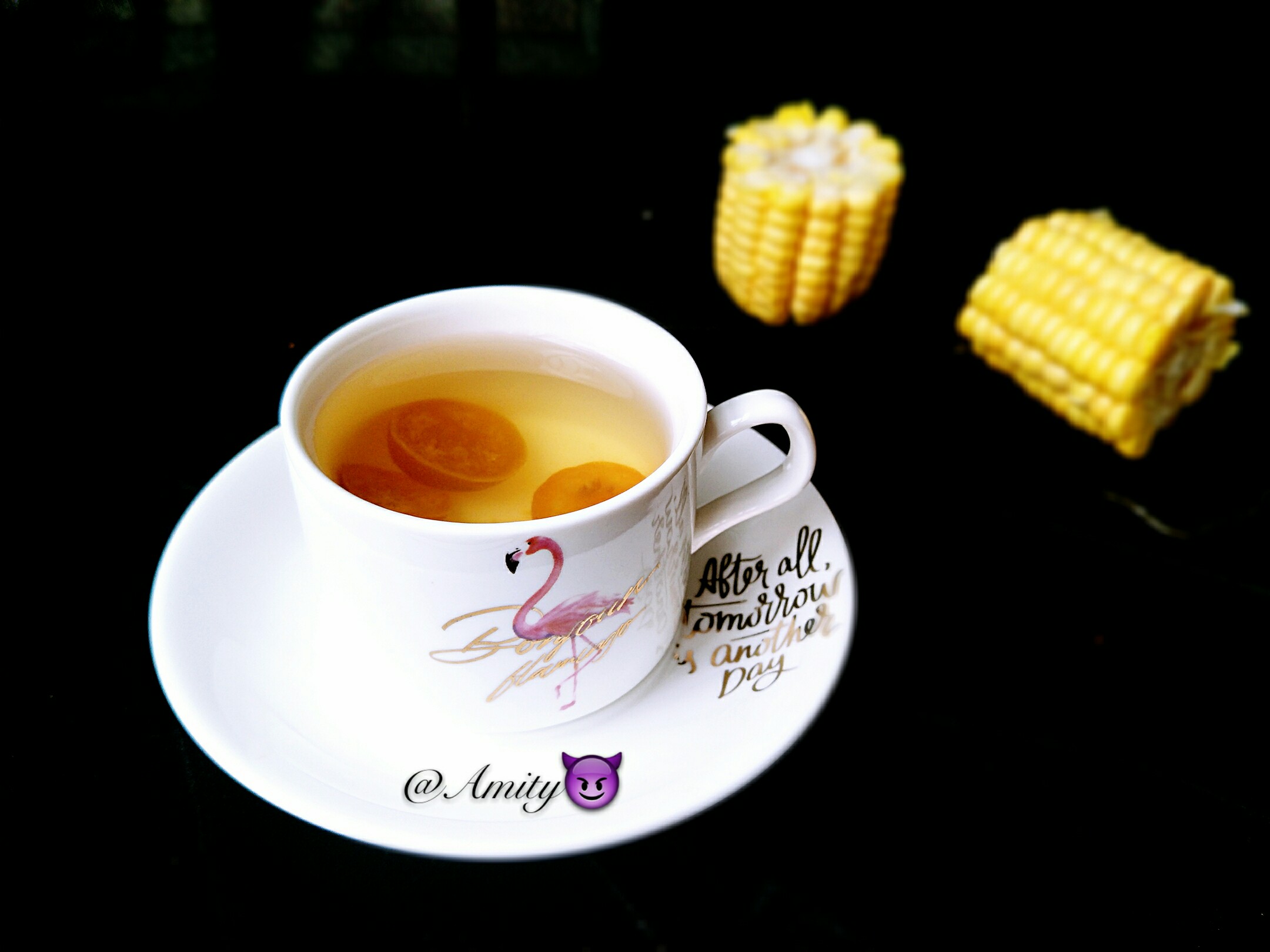 奶酪烤吐司片,金桔膏水,蒸玉米,樱桃小番茄
