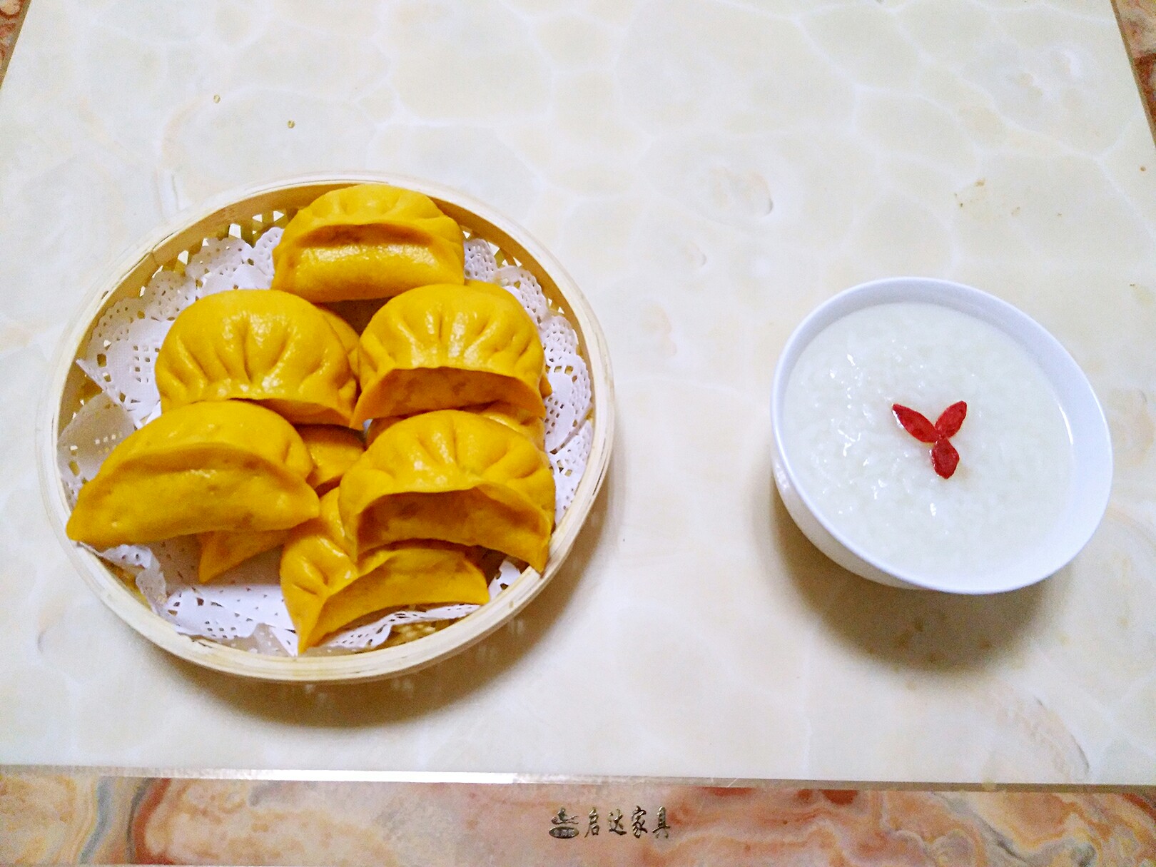 猪肉水萝卜馅儿南瓜蒸饺,大米粥[愉快]