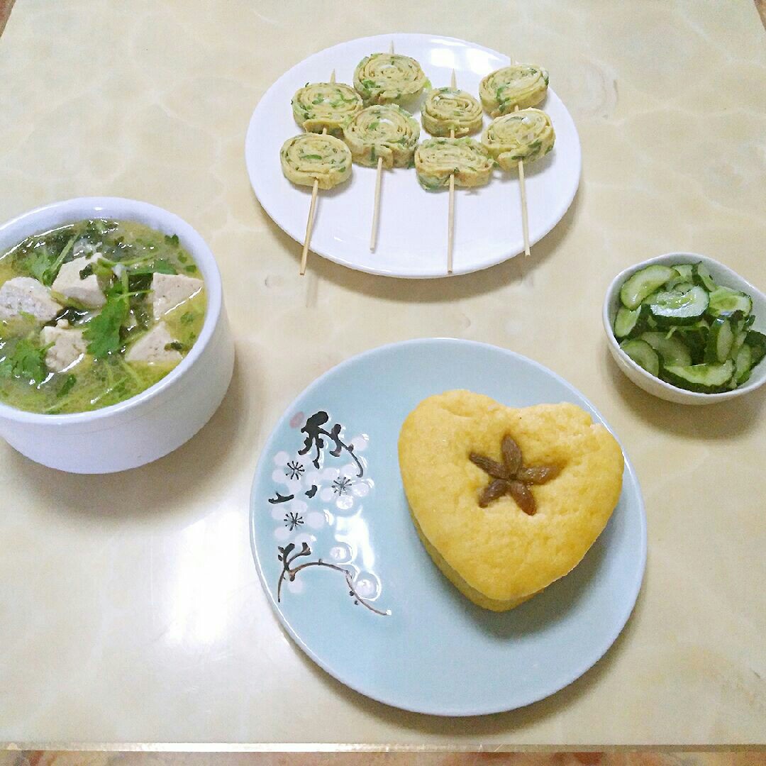 玉米面发糕,紫菜豆腐虾皮汤,鸡蛋卷,黄瓜咸菜[愉快]