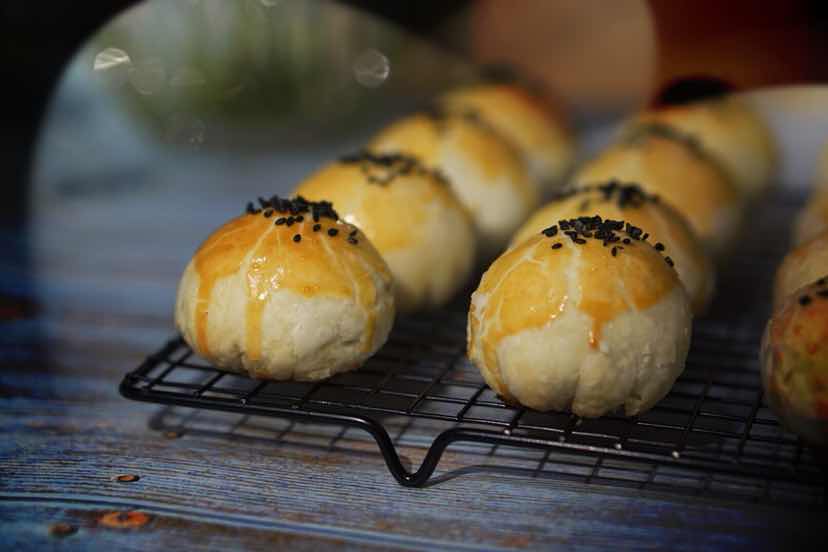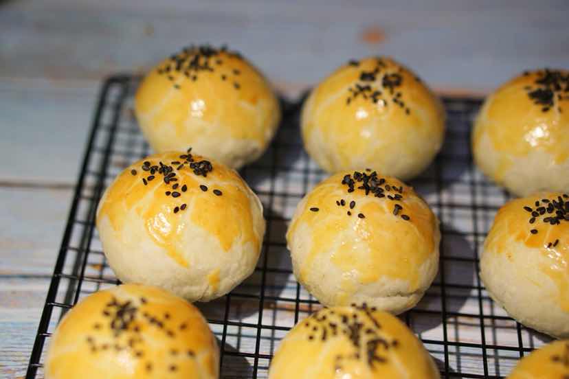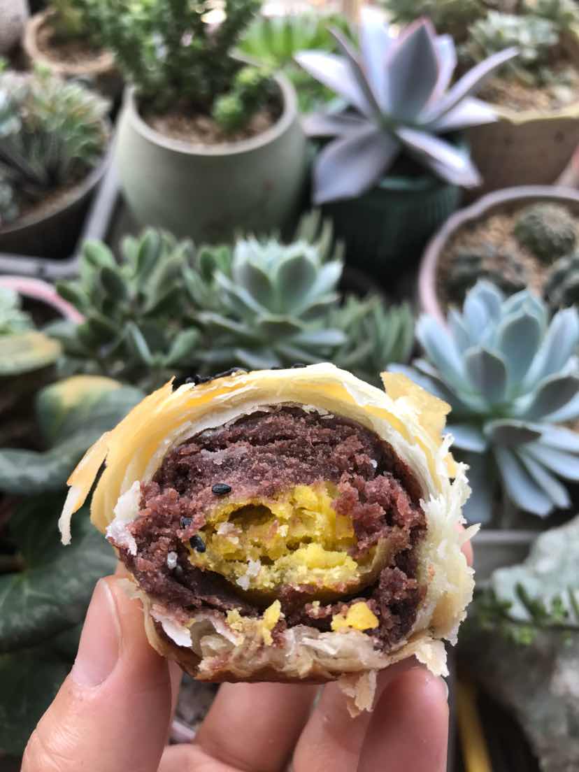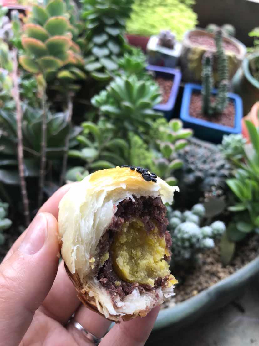 酥的掉渣,自己炒的豆沙馅好吃,淡淡的不甜。