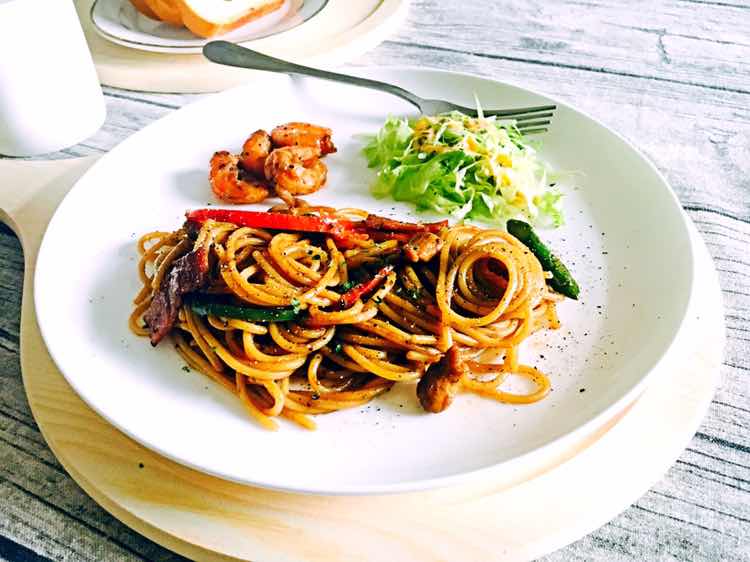早餐,黑胡椒意面搭蔬菜沙拉和烤虾仁。