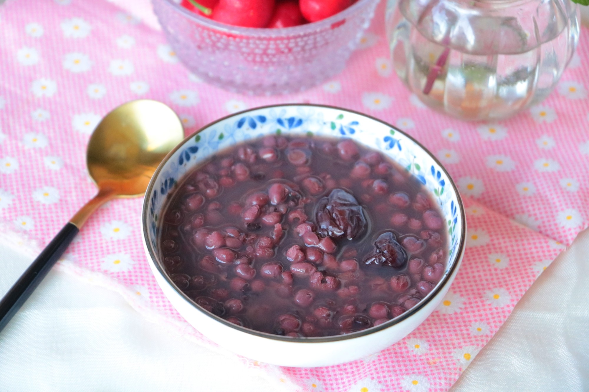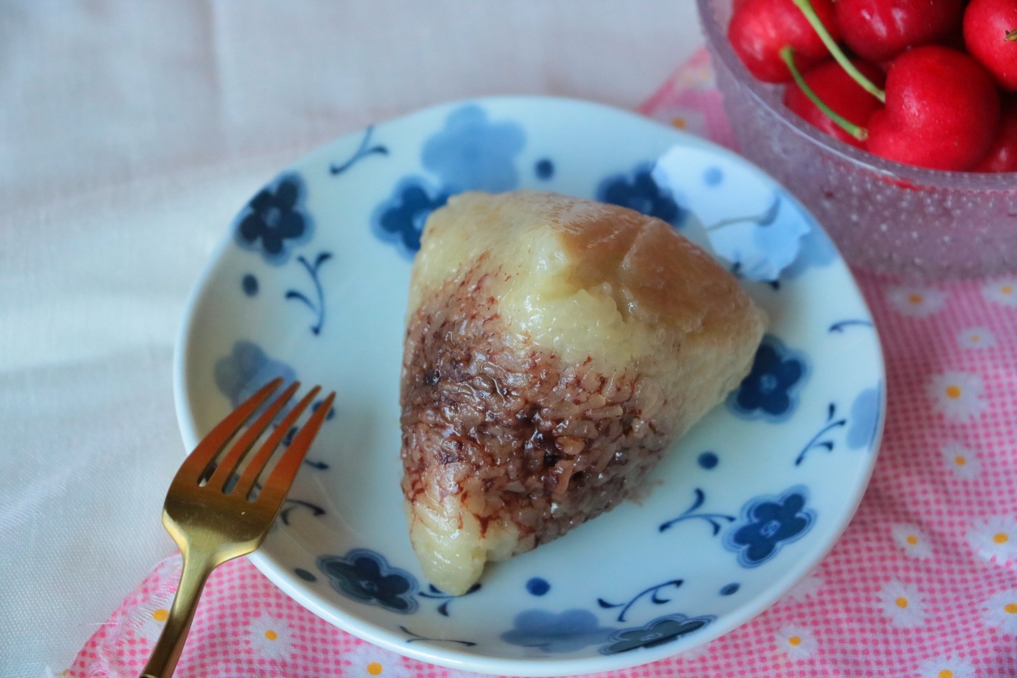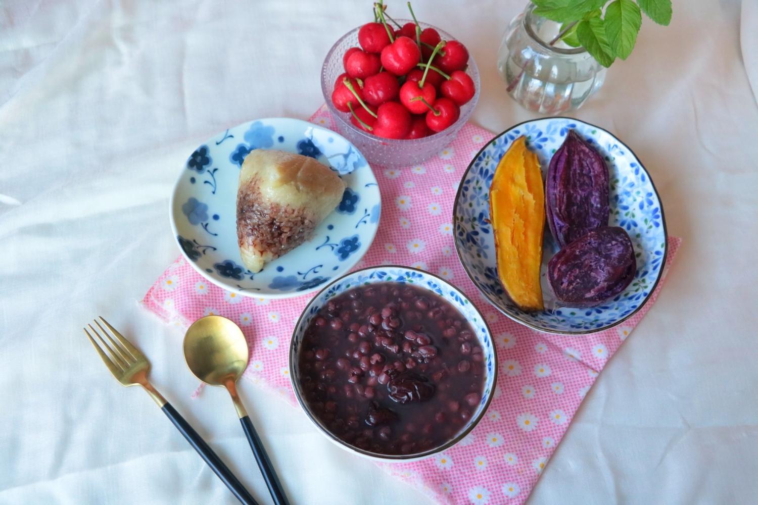 20180516:红豆薏仁黑米粥,豆沙粽子,蒸紫薯,蒸山芋,樱桃~