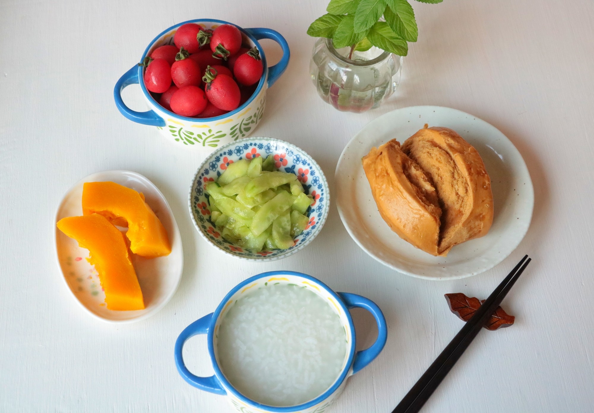20180517:白粥,凉拌黄瓜,红糖馒头,蒸南瓜,小番茄~