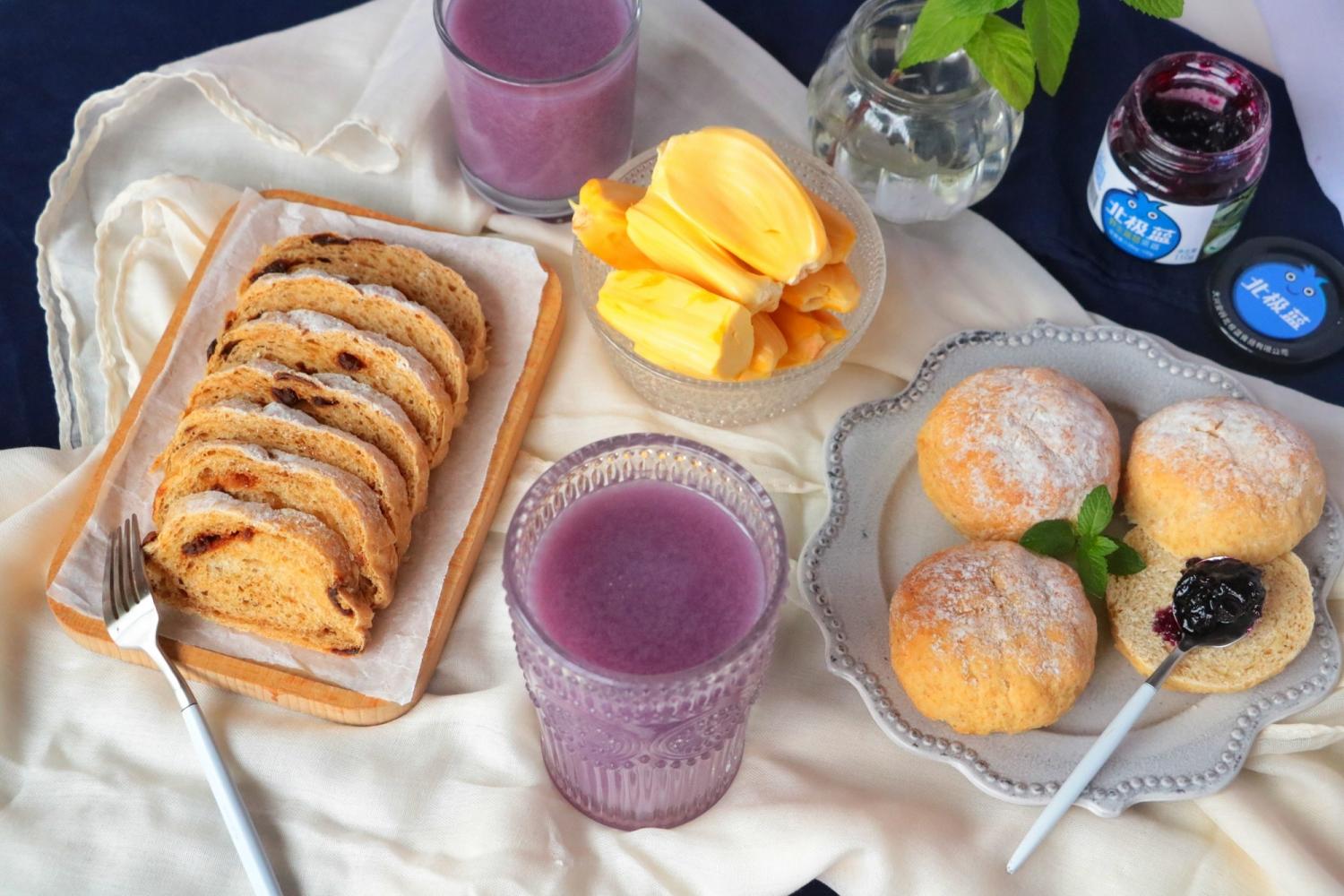 20180520:紫薯米糊,红糖桂圆软欧包,全麦牛奶面包配蓝莓果酱,菠萝蜜~