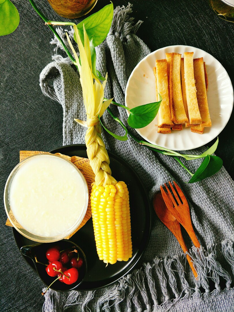 香脆吐司条、水果玉米、鸡蛋汤
