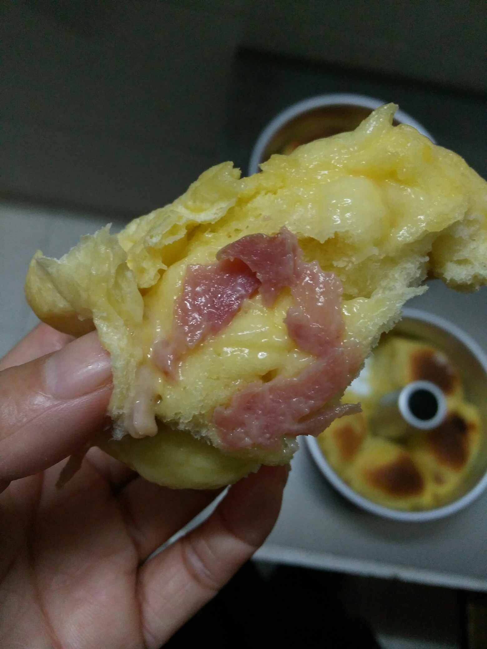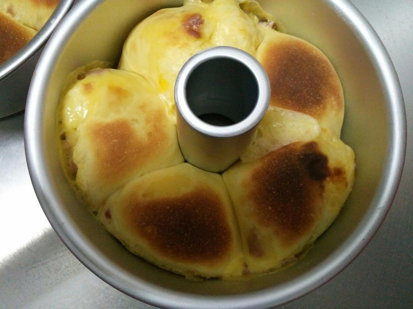 听了刘大花老师的课,第一次尝试着做这款爆浆面包,家里没有厨师机也没有面包机,手揉的面包,也不知道算不算手套膜,揉的时候忘了拍照了,7寸8寸的磨具一下子放不下,做了10个放2炉刚刚好(每个约53g)同层同时烤的,中空的那个磨具没有那个圆模上色均匀。烤好自己先吃了一个,味道不错,继续练习,先把处女作作品传了。