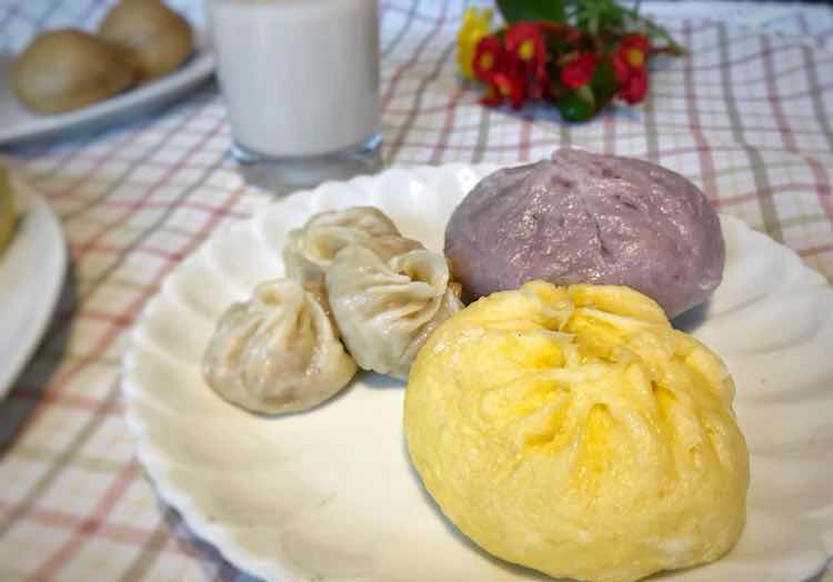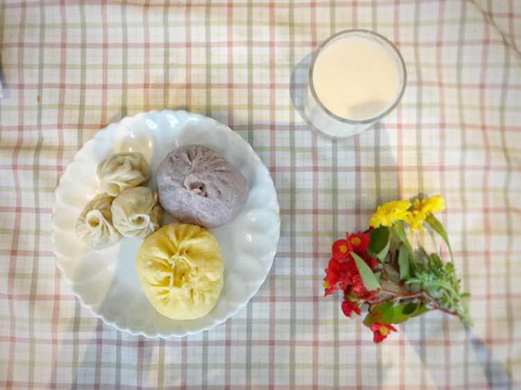 今日份早餐: 南瓜包+火龙果包+小笼包+窝窝头+玉米+牛奶