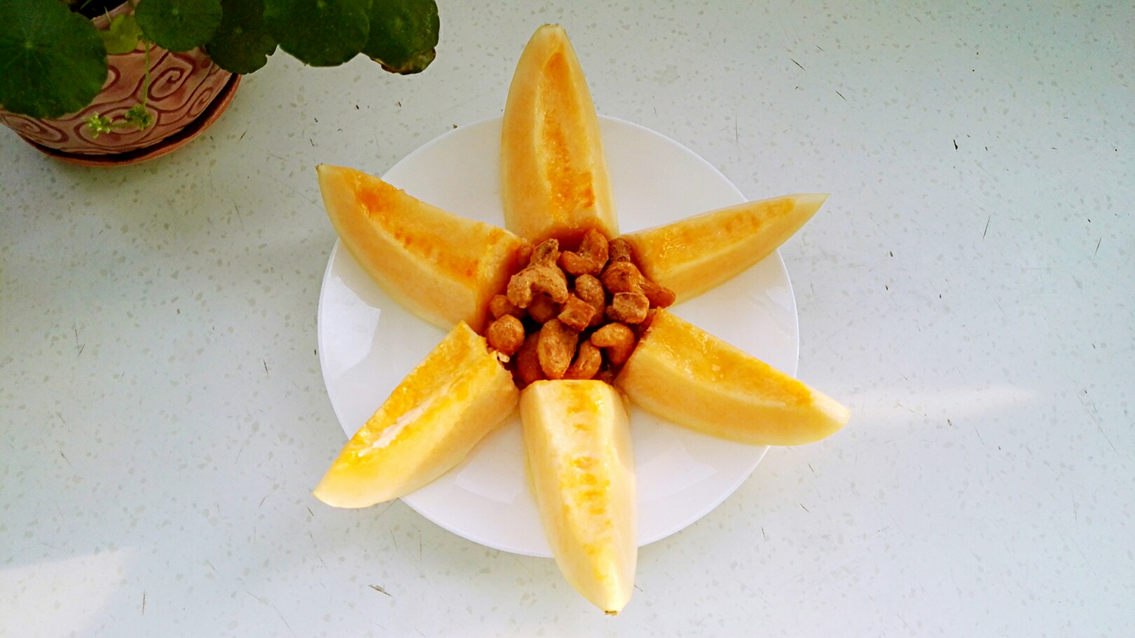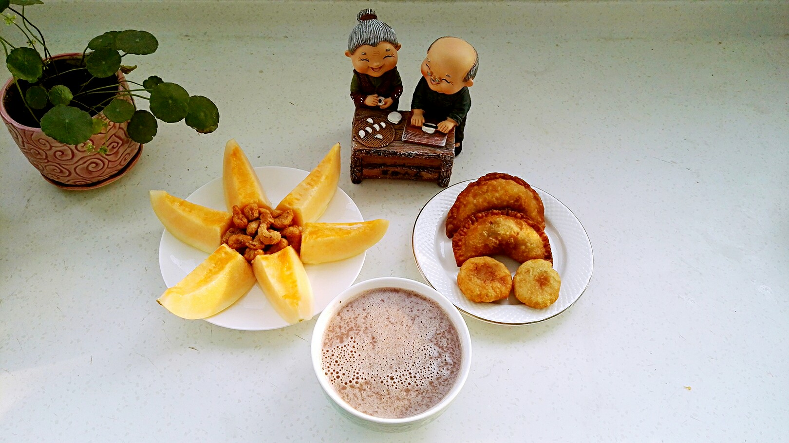 早餐:炸菜角(鸡蛋韭菜粉条馅)、炸糖糕、甜瓜、盐焗腰果、红豆薏仁浆(电砂锅预约的红豆薏仁粥放欧诺华破壁机按豆浆键搅二十秒成无渣的浆)。(菜角图七的颜色就可以捞出来了,录个小视频浪费点时间,图六颜色有点重了。)