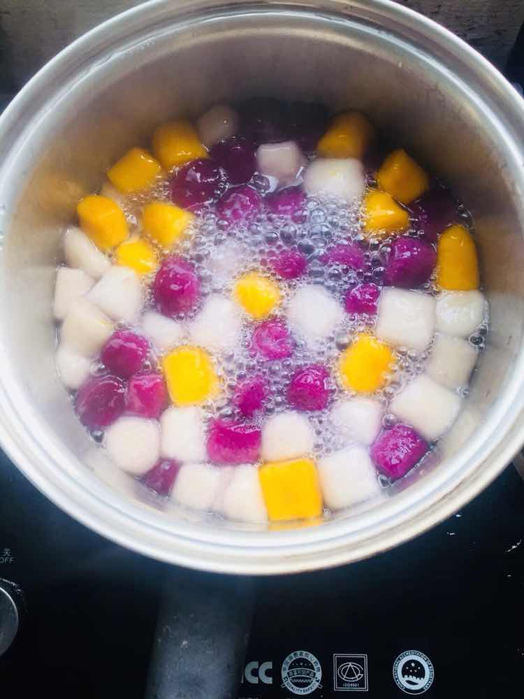 南瓜味芋圆:木薯粉 南瓜泥 细砂糖 100度开水 山药味芋圆:木薯粉 铁棍山药 细砂糖 100度开水 紫薯味芋圆:木薯粉 紫薯泥 细砂糖 100度开水 椰浆芒果味汤底:芒果果肉 纯牛奶 椰浆 细砂糖 烧仙草牛奶汤底:纯牛奶