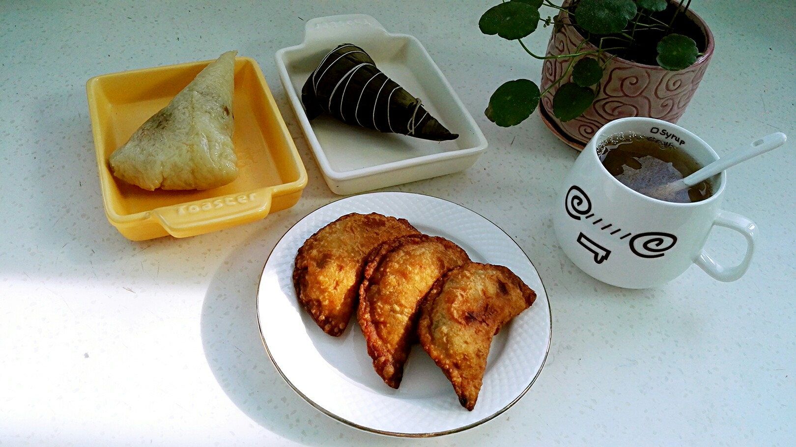 #无华家的粗茶淡饭# 早餐:炸菜角(九阳空气炸锅160度5分钟加热下),砂锅美容养颜粥(红枣桃胶莲子百合银耳),蜜枣杂粮粽(黑花生绿豆蜜枣糯米)。