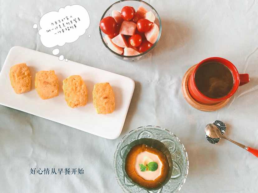 瑶柱奶油鸡蛋蒸贝贝小南瓜,烤馒头片,咖啡(今天调的越南咖啡味道最满意),水果
