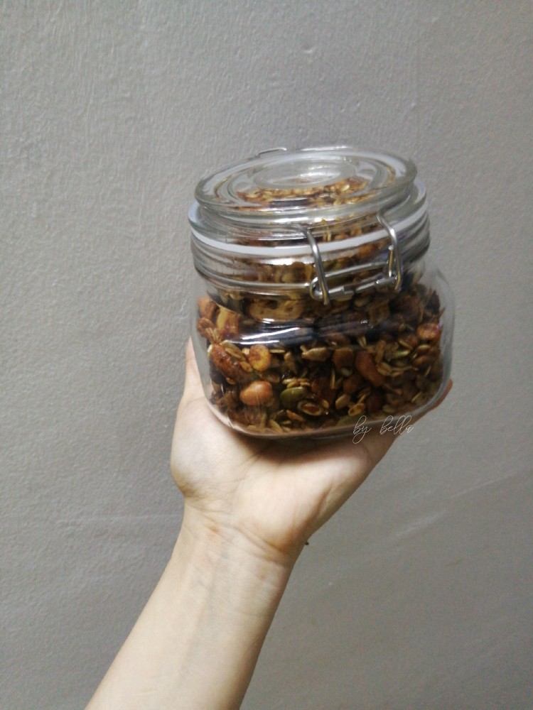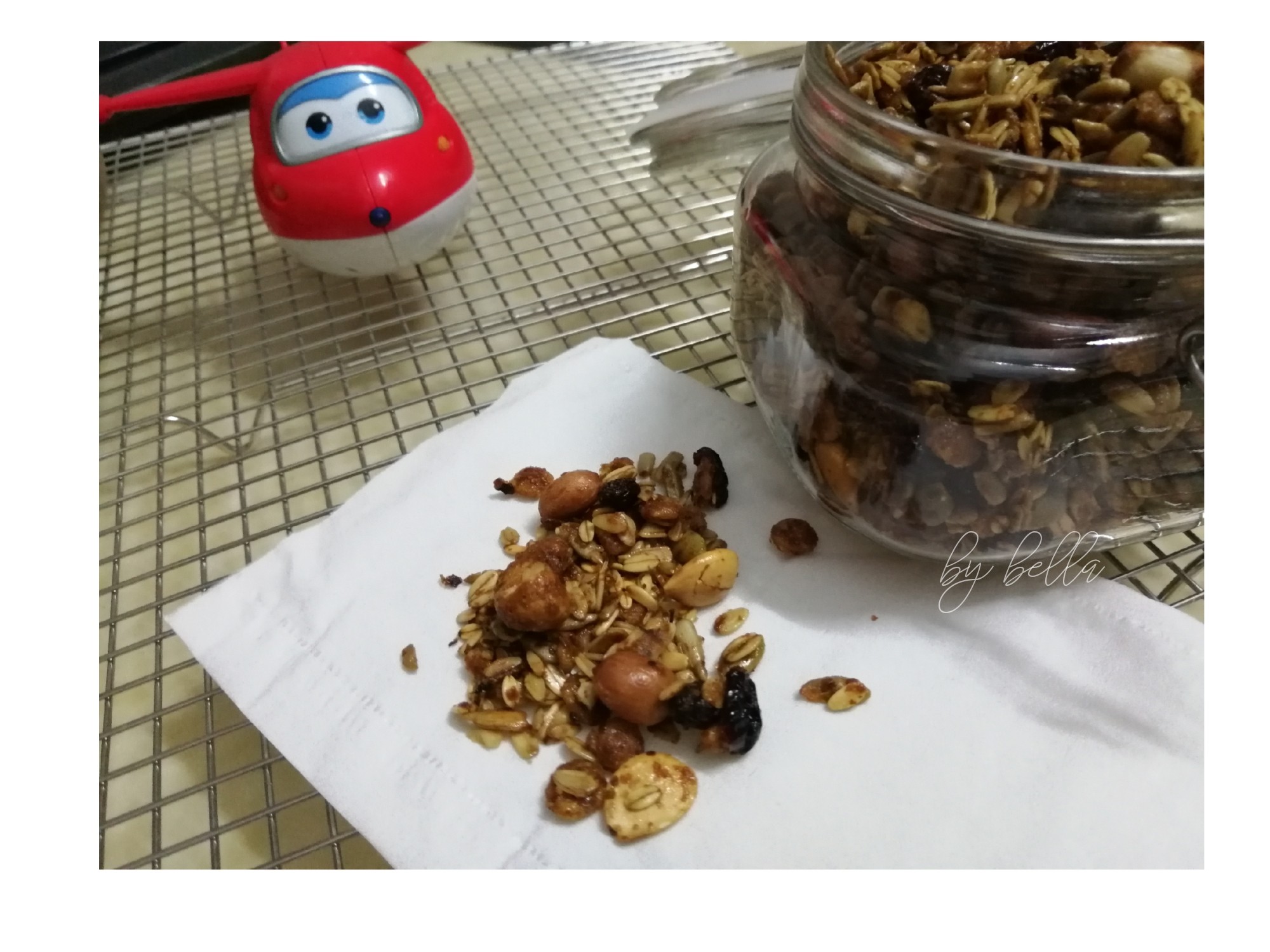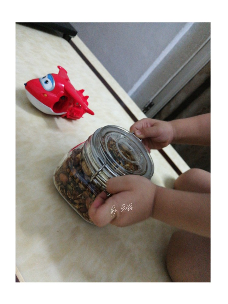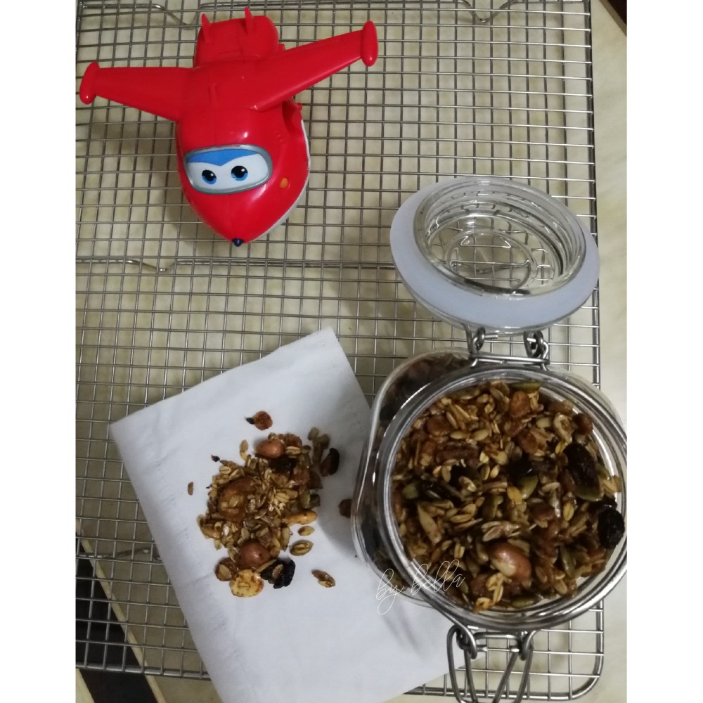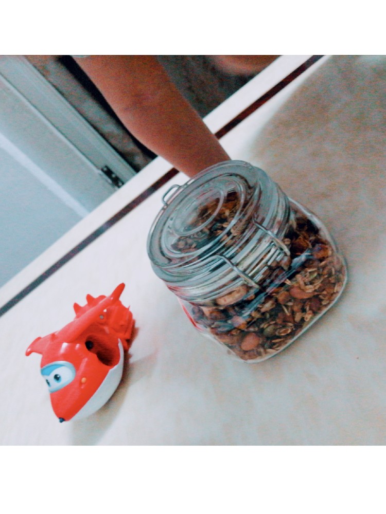 收拾好食材 整个坚果烤麦片[奸笑][奸笑][奸笑][机智]拌酸奶 冲豆浆 好伙伴[机智][耶](麦片玉米片 花生 腰果 杏仁 葵花瓜子仁 南瓜籽 野生核桃 小麦胚芽 葡萄干 蔓越莓干)。 小胖手连续偷吃好几口了