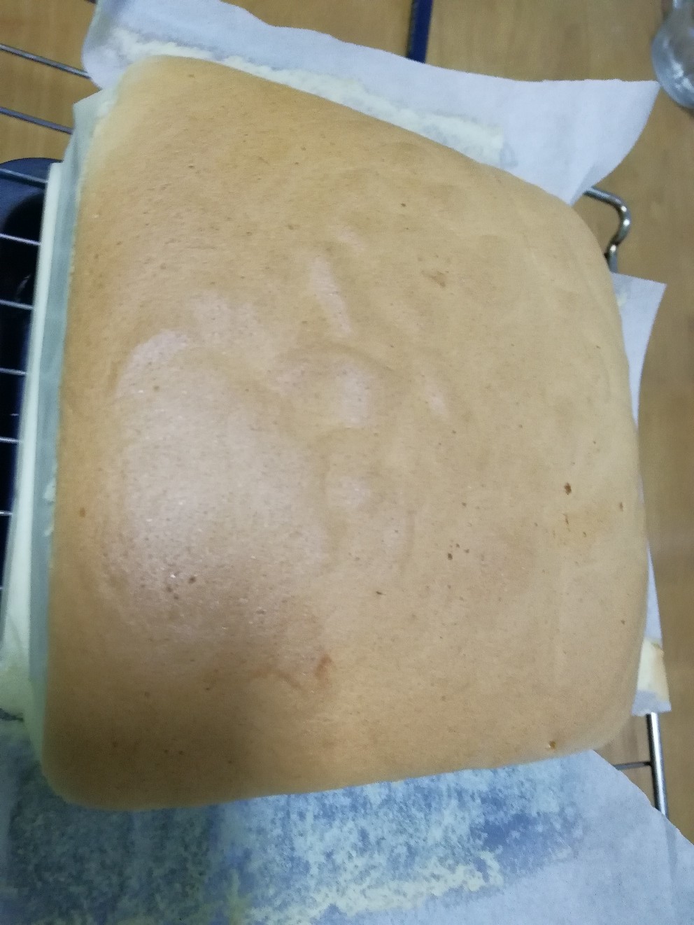 20*20烤盘,没有低筋粉用了普通面粉,细腻程度上跟老师的蛋糕有差别。面粉用了112克,其它都一样的。