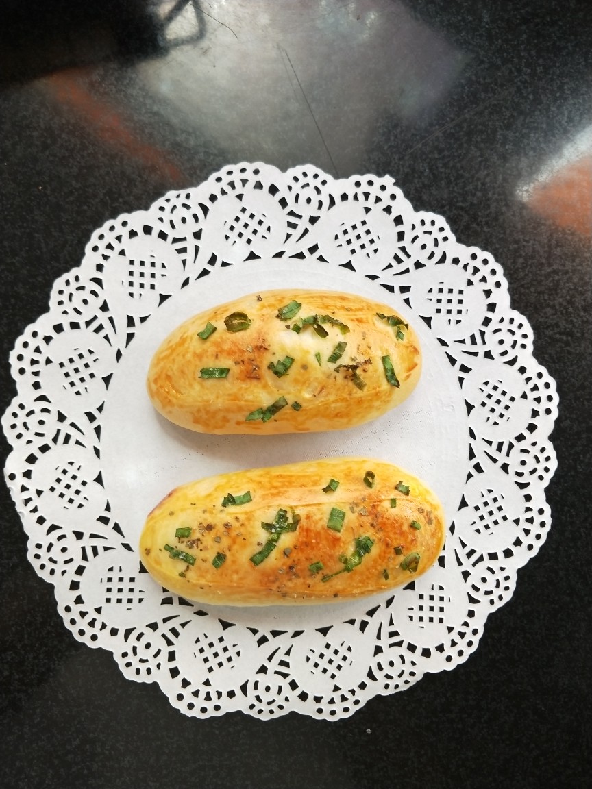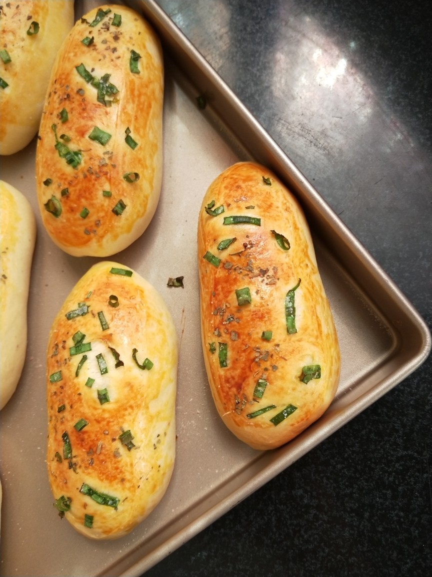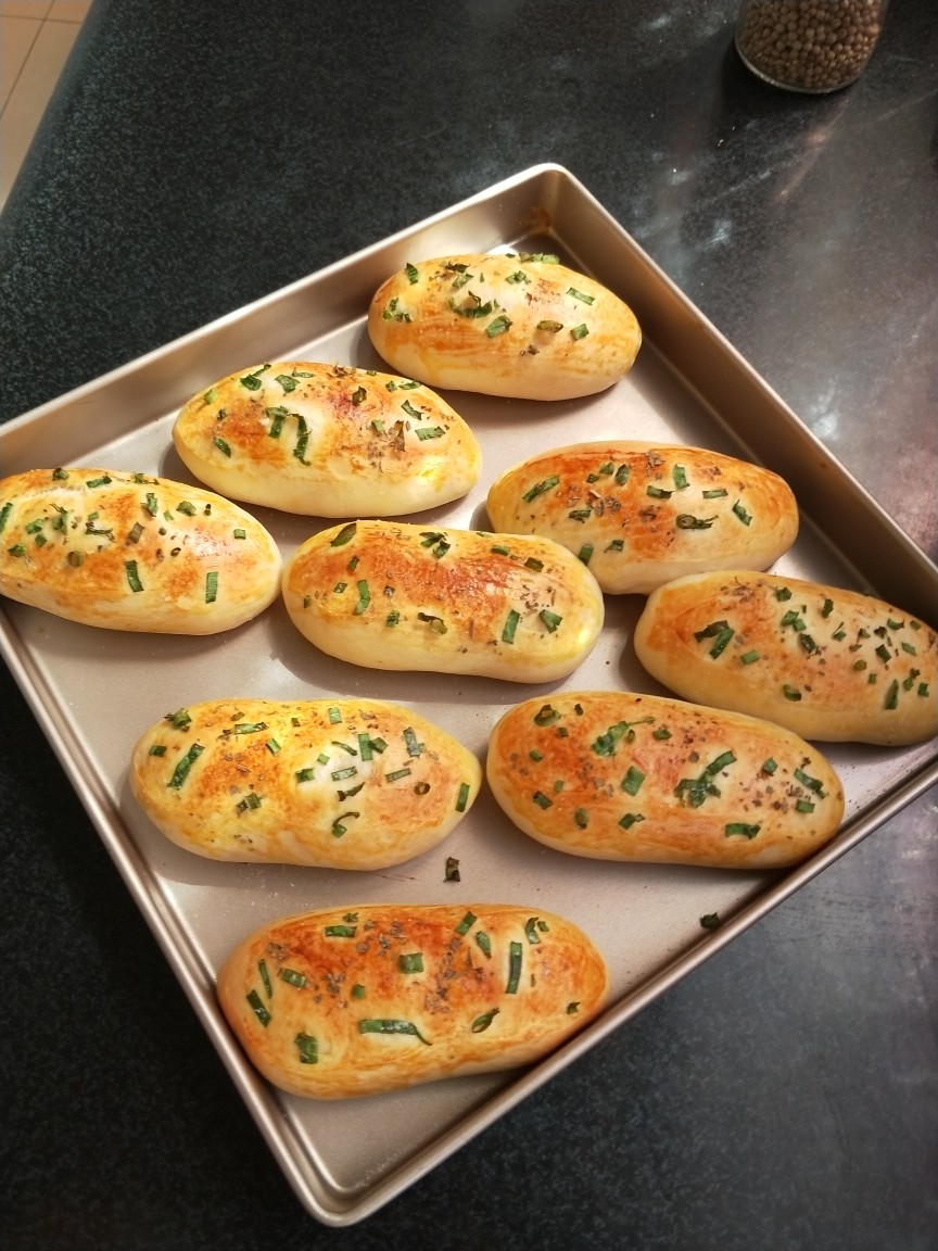 原谅我是手残党,整形困难户,自己加了点罗勒,感觉也还不错,喜欢咸面包,这个是首选。