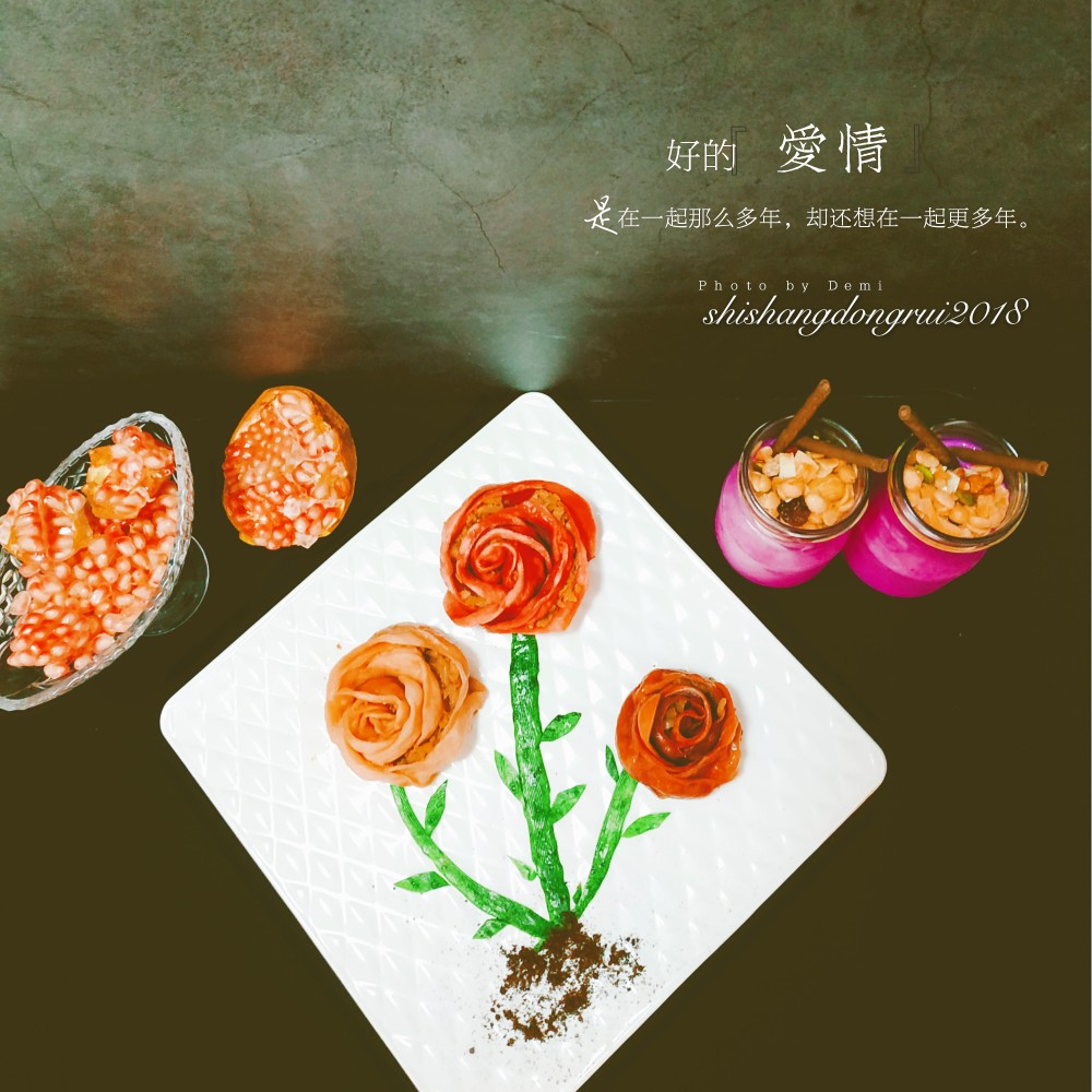玫瑰花蒸饺+火龙果奶昔+石榴