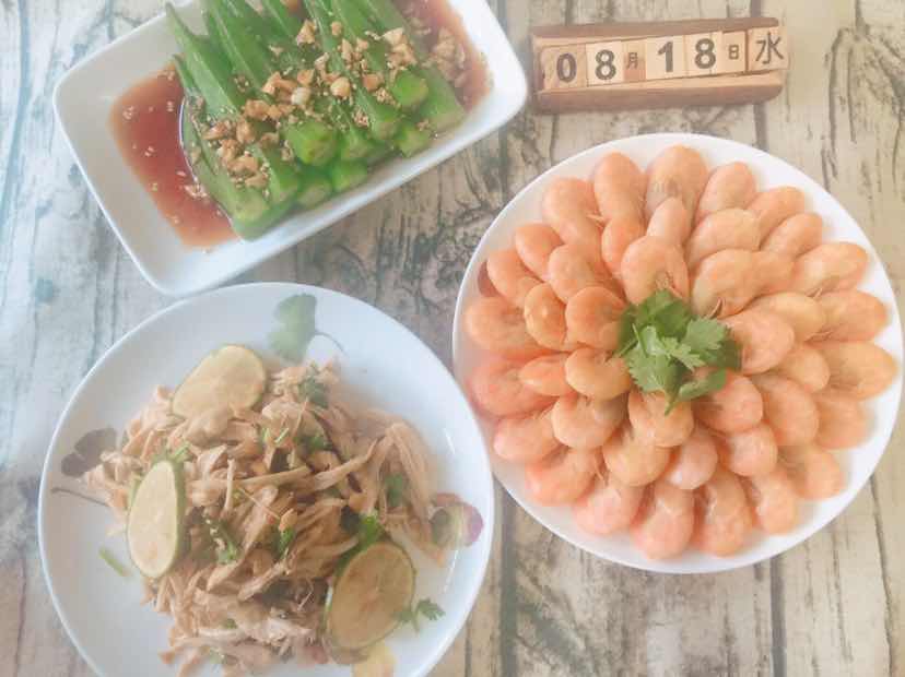 凉拌秋葵,多籽虾,柠檬香菜鸡丝