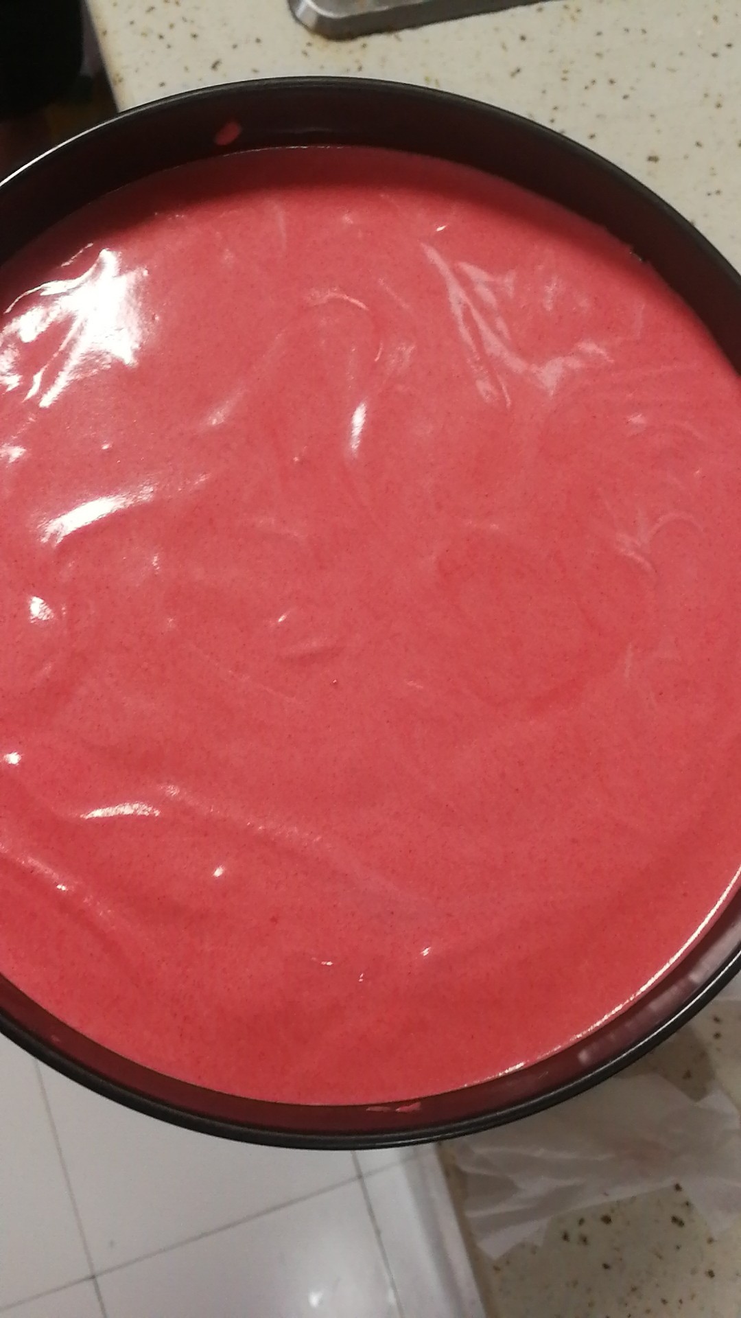 8寸圆模:鸡蛋4个(带壳60g)、细砂糖90g、牛奶60g、色拉油50g、低筋面粉90g、红丝绒液4g 烘烤时间:上下火150℃,65分钟。酸奶淋面,残渣点缀。