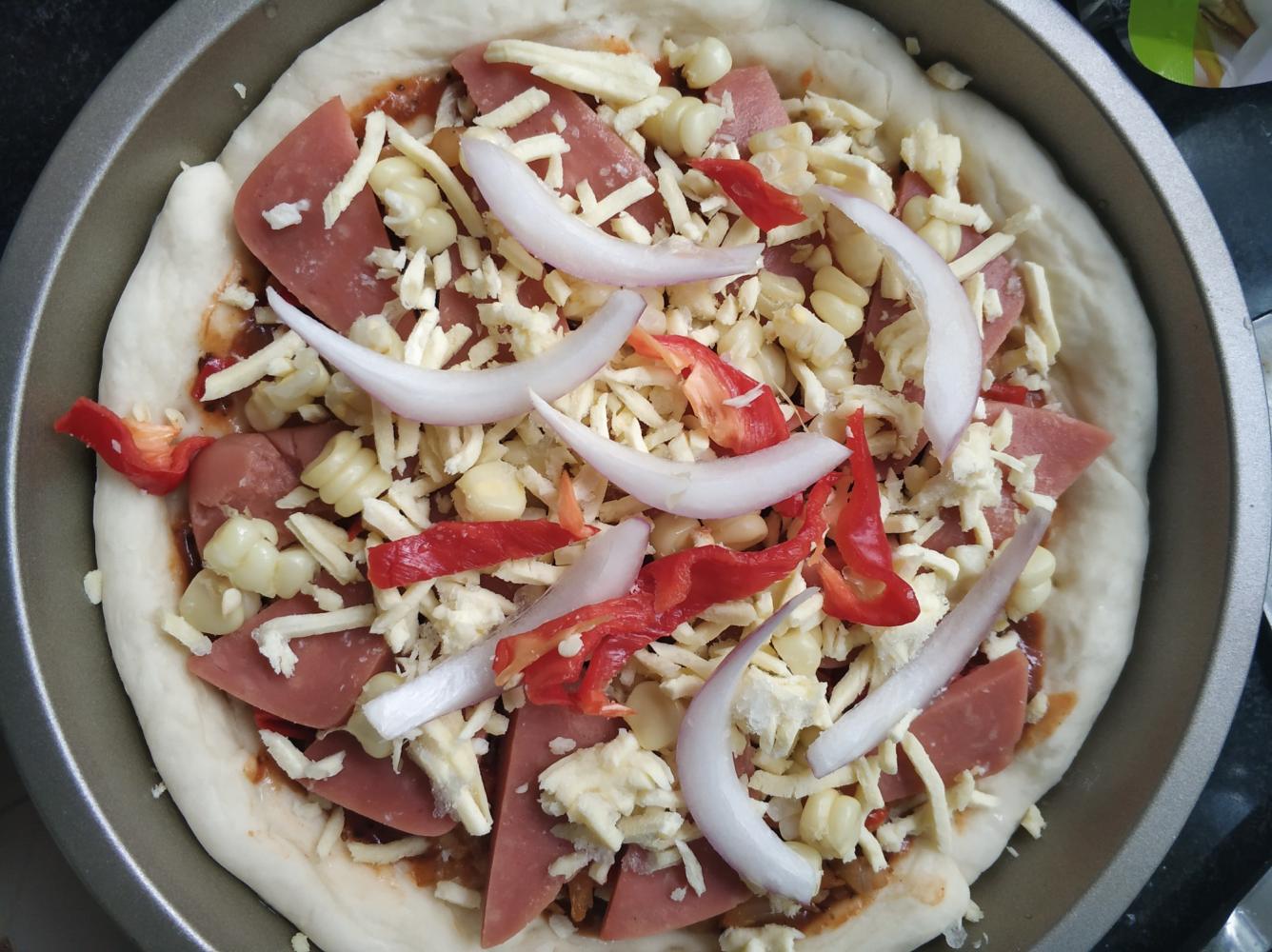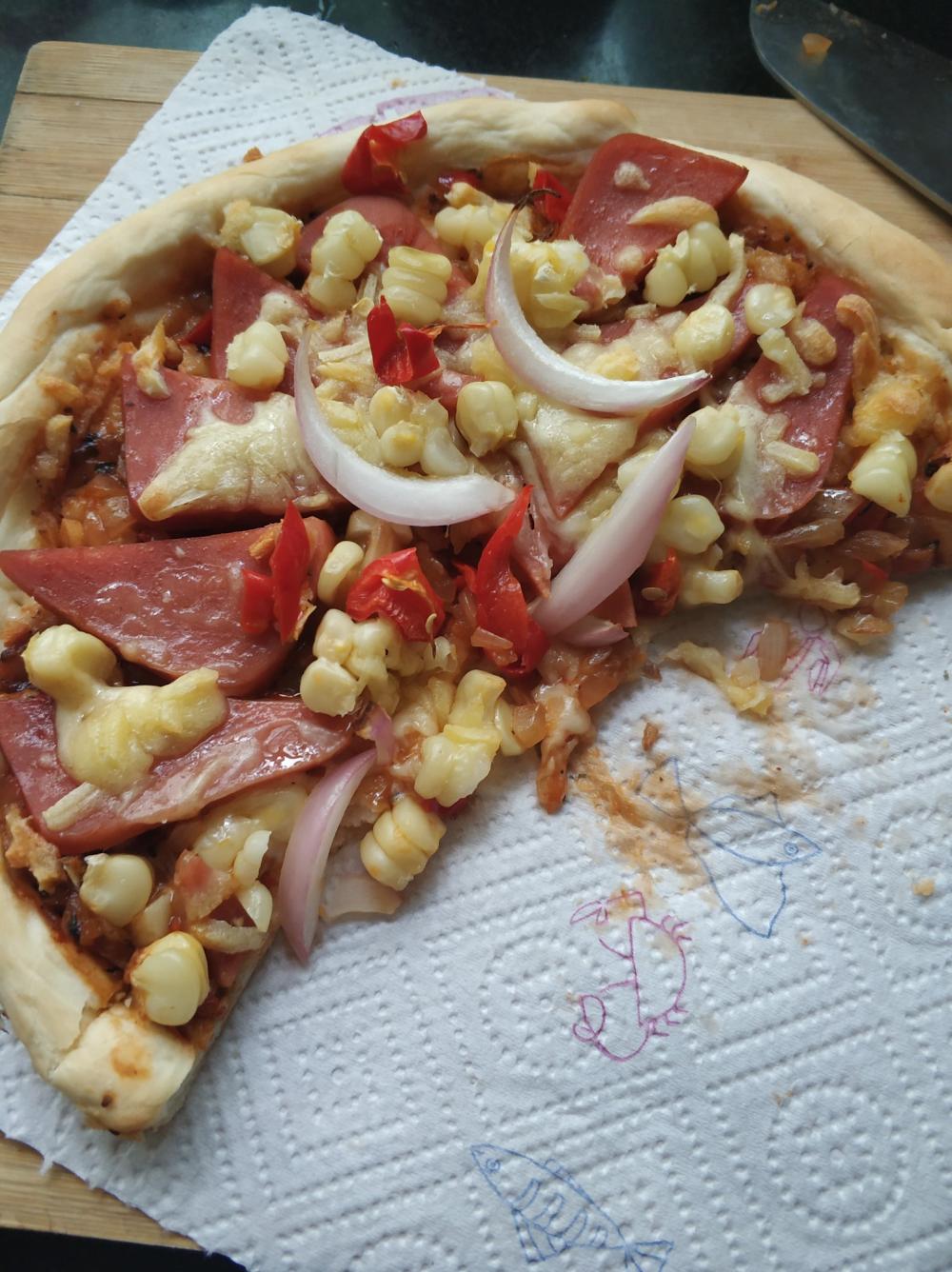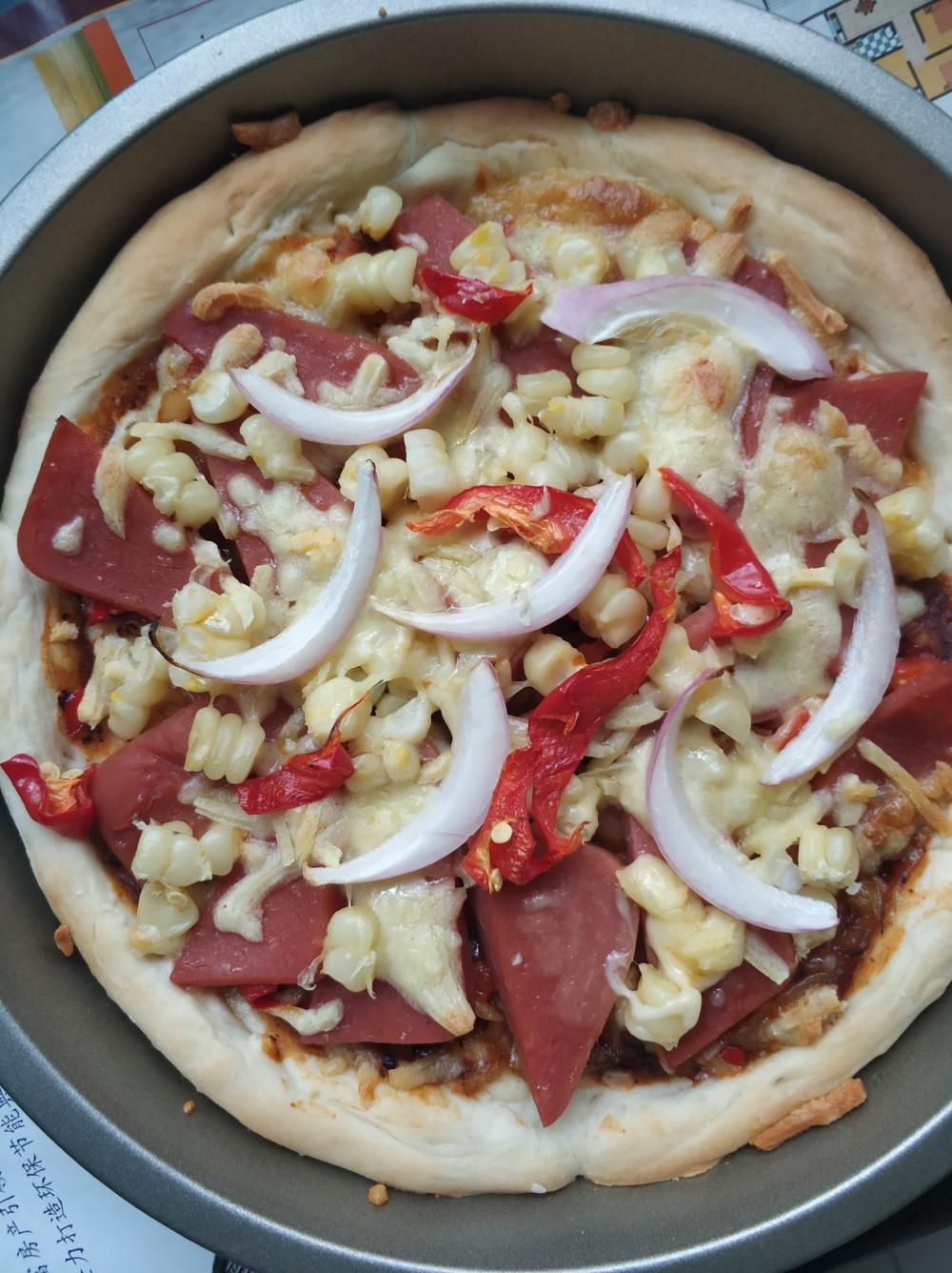 家里没有虾和胡萝卜,换成了火腿肠和玉米粒,芝士放少了,拉丝效果一般,但味道真的棒棒哒!