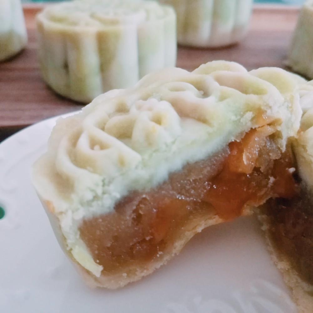 桃山月饼使用了几种口味的馅料制作,再加一层奶黄流心陷制作而成。