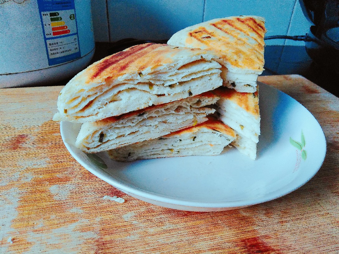 千层饼,馅里放了椒盐和葱花