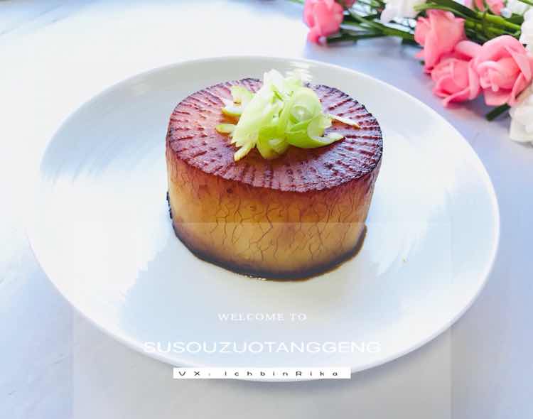 早伙伴们 周三早餐约饭白萝卜: 日式大根烧 开花馒头 一个暖胃的萝卜丸子汤 大根烧 用料 : 白萝卜 蔬菜粉 ( 鸡粉或鸡汤代替 ) 水 酱油 制作方法: 1.白萝卜去皮,切成圆形厚片。 2.锅里煮开水,放入白萝卜和蔬菜汤包,用中小火煮至软身。 3.白萝卜捞出沥乾备用。 4.白萝卜两面沾上酱油,用中大火煎至焦香,再撒上葱花 , 完成!
