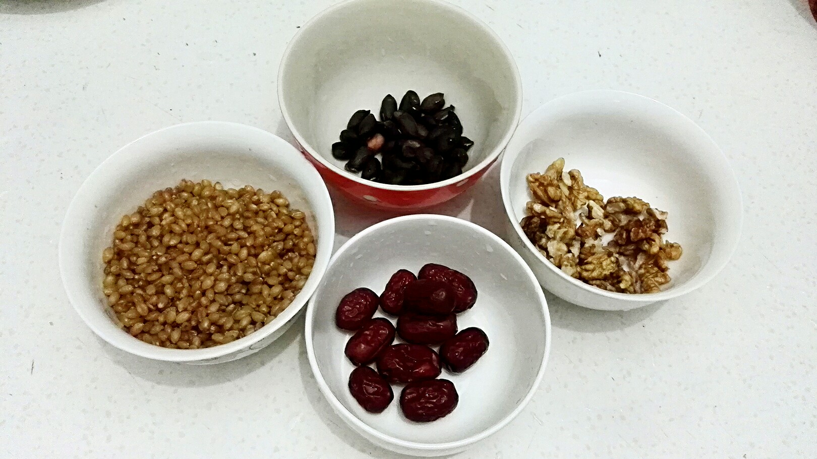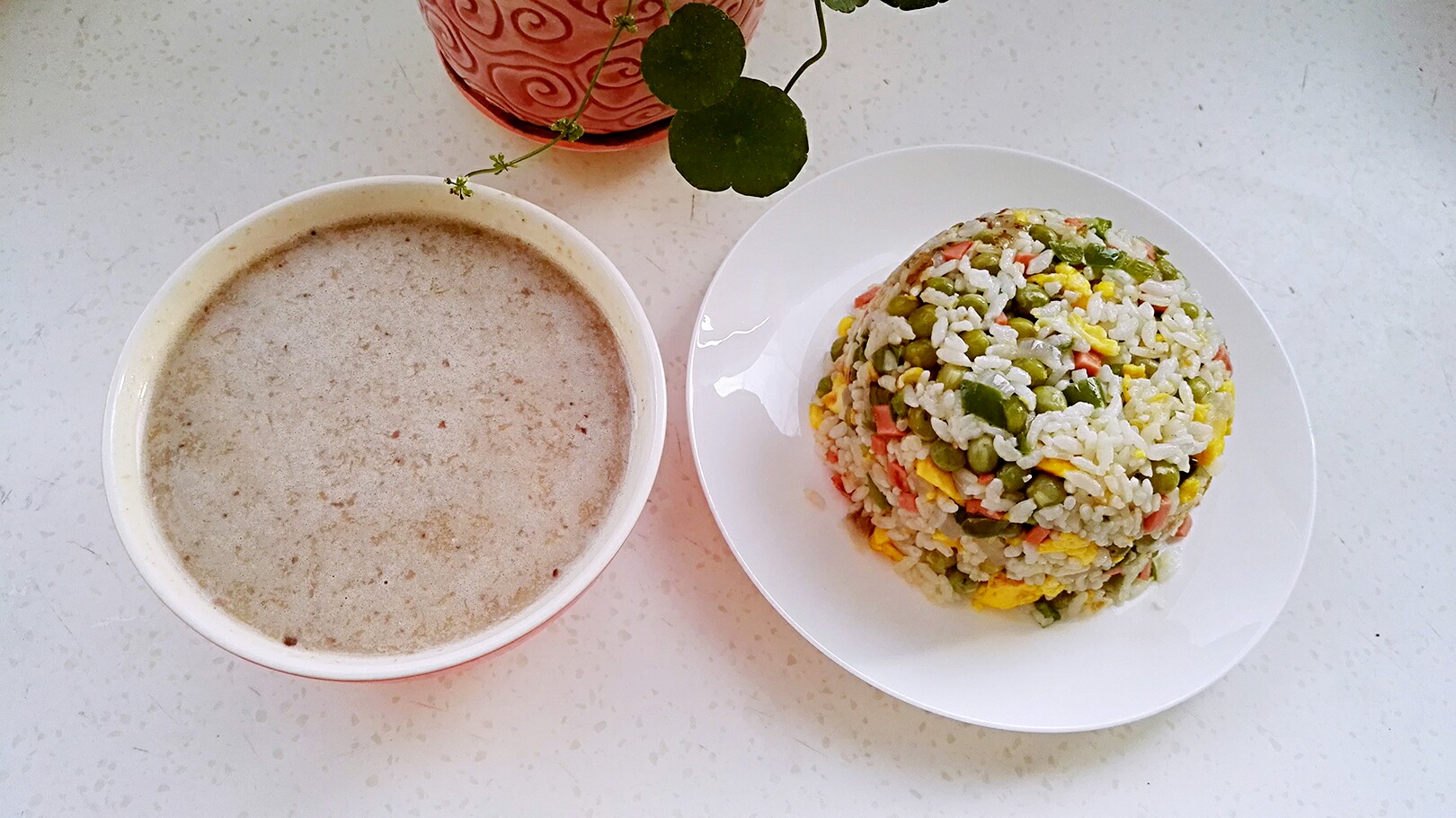 #无华家的粗茶淡饭# 早餐:杂粮浆(灰枣、小麦、野生山核桃仁、黑花生),蛋炒饭(鸭蛋、豌豆、辣椒、洋葱、火腿肠、米饭等)。