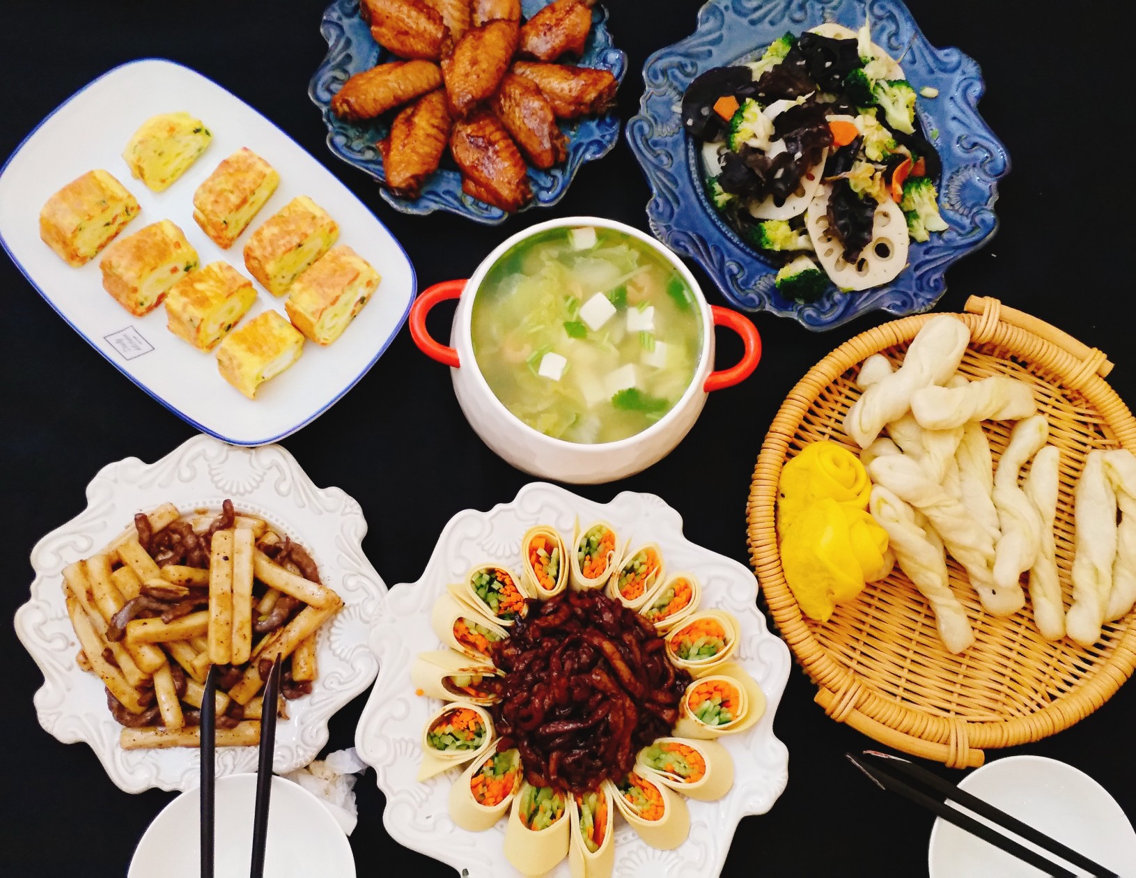 京酱肉丝,黑椒牛柳炒年糕,可乐鸡翅,厚蛋烧,白菜豆腐虾仁汤!