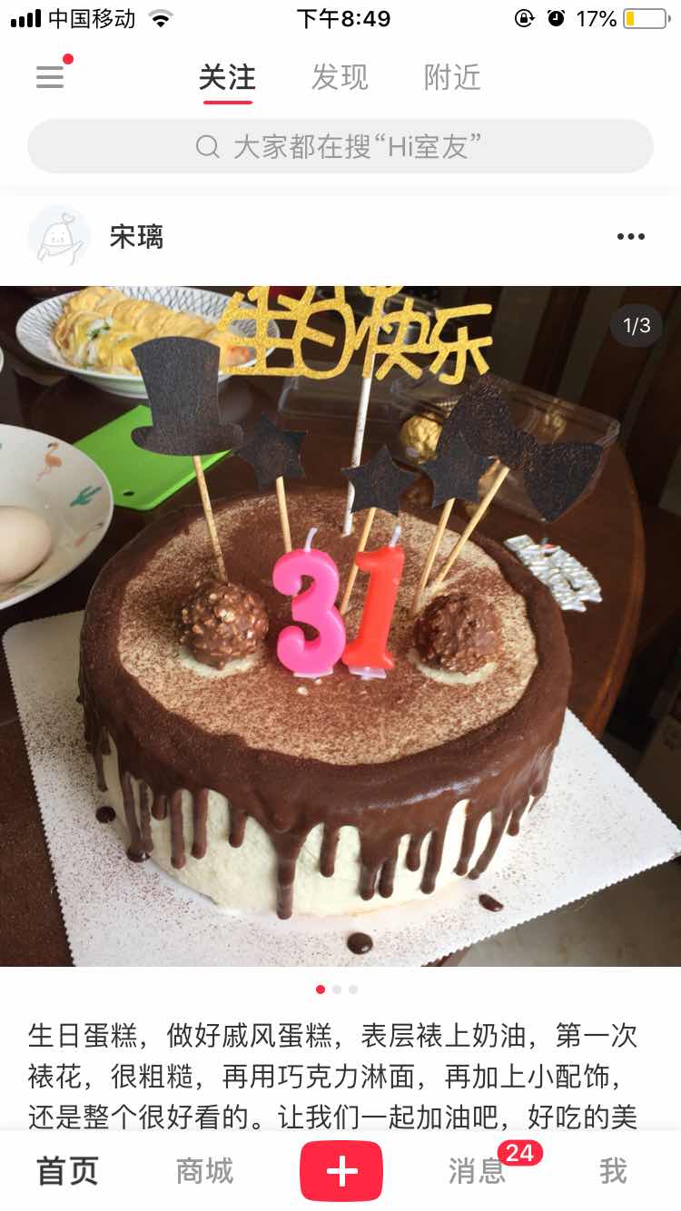 生日蛋糕,做好戚风蛋糕,表层裱上奶油,第一次裱花,很粗糙,再用巧克力淋面,再加上小配饰,还是整个很好看的。让我们一起加油吧,好吃的美食一起分享