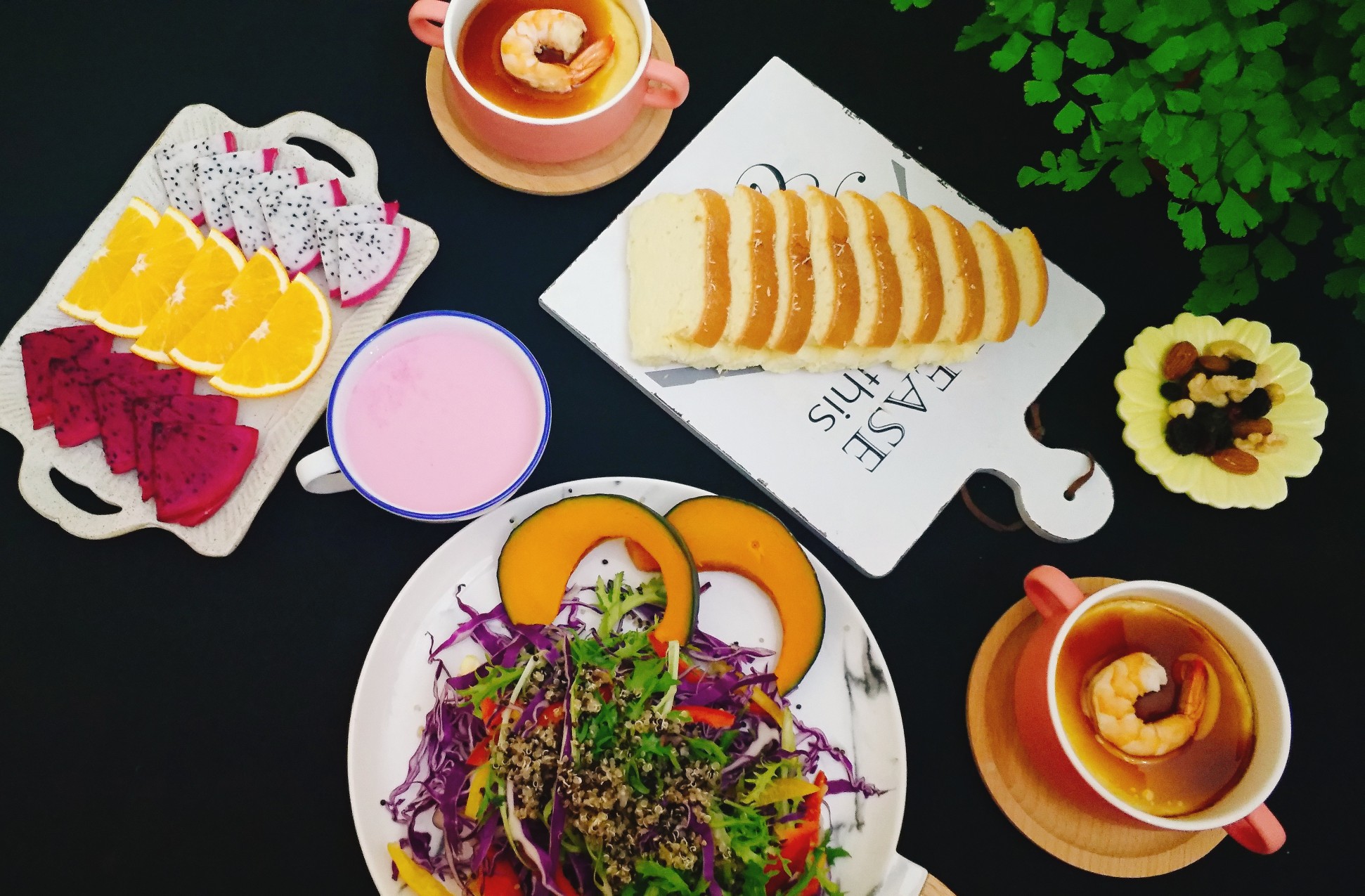 乳酪蛋糕,鲜虾鸡蛋羹,火龙果脱脂牛奶,沙拉菜南瓜,每日水果!1018-10-26