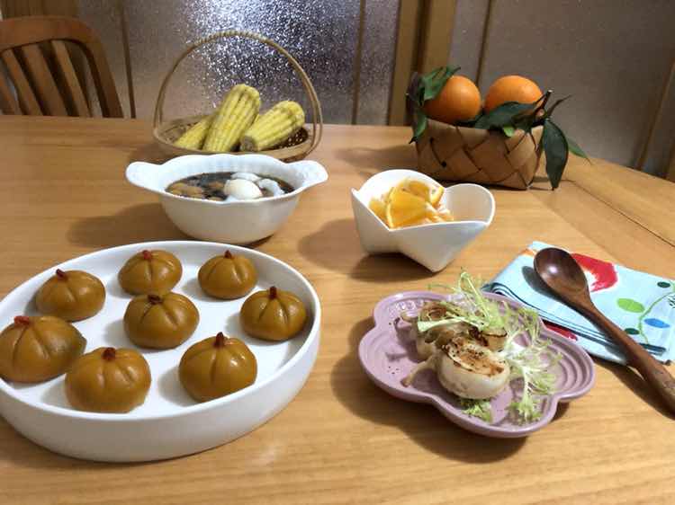 早安!周五! 今日早餐:鸡蛋红豆圆子,南瓜饼,黄油煎扇贝,水果!