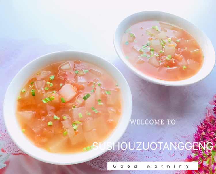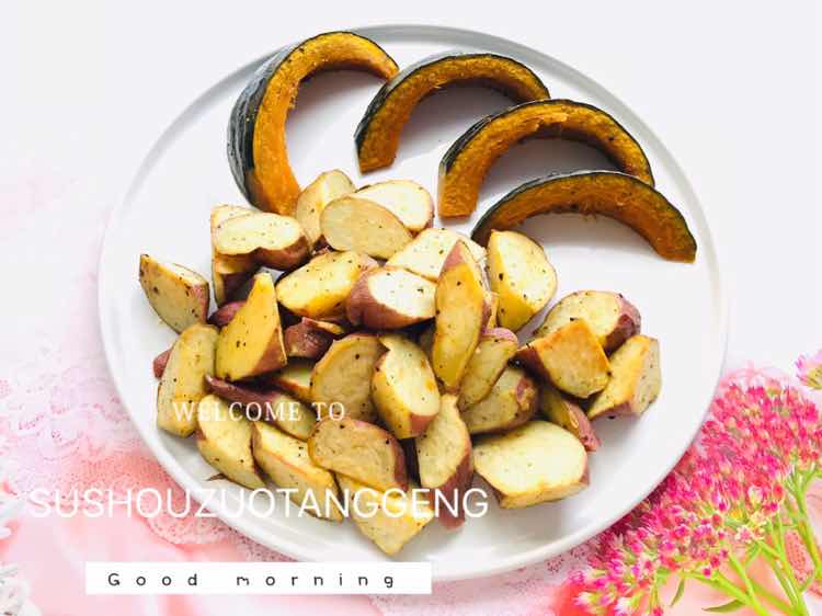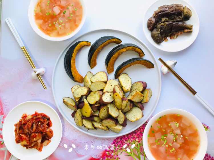 早上好 享受阳光,享受生命,期待完美的一天! 早餐:椒盐烤南瓜烤红薯 西红柿冬瓜汤 两个小泡菜