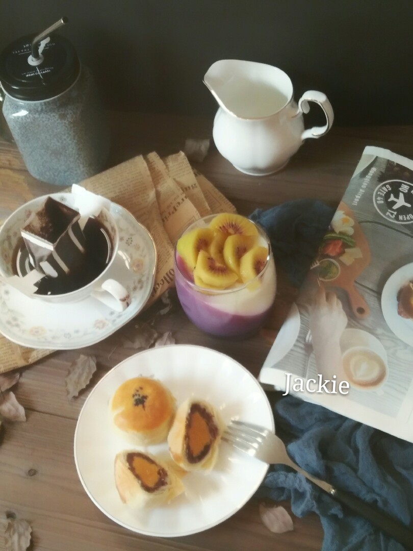 紫薯酸奶布丁,奇亚籽杯,蛋黄酥,挂耳咖啡