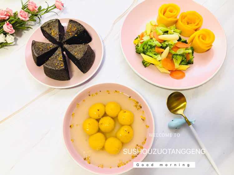 早ノ☀ 只有心情是快乐的,看到的事物也就变美好了。每天都要开心的度过呀! 早餐:黑芝麻南瓜汤圆 素炒西兰花 黑米蒸糕