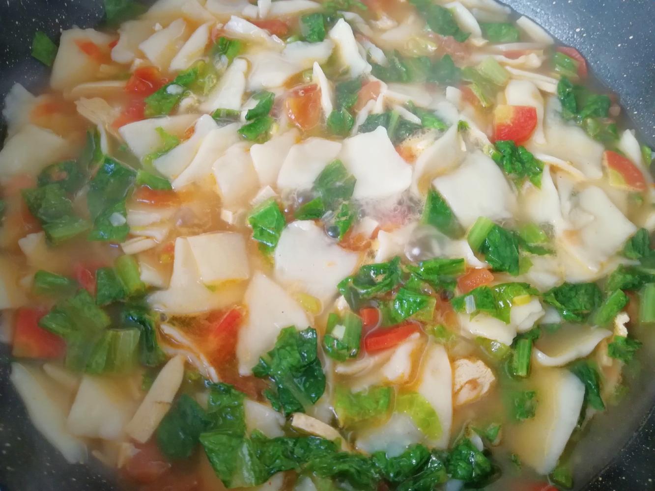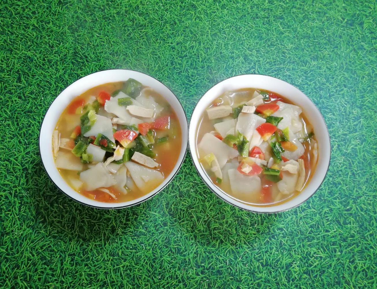 蔬菜烩面片+萝卜丝虾皮鸡蛋饼+橙子