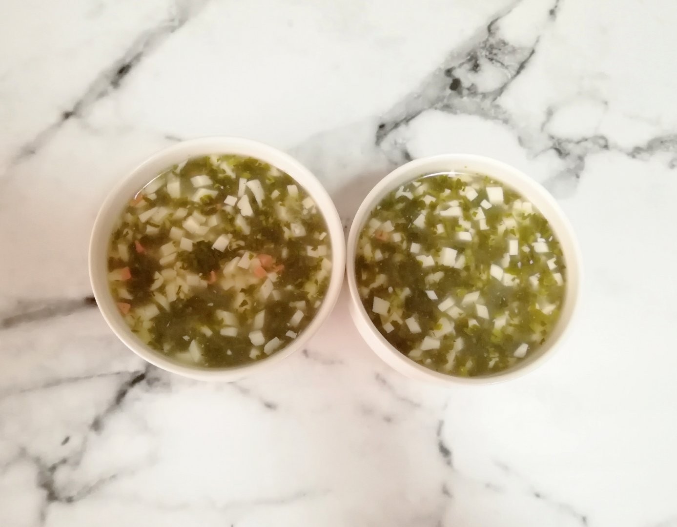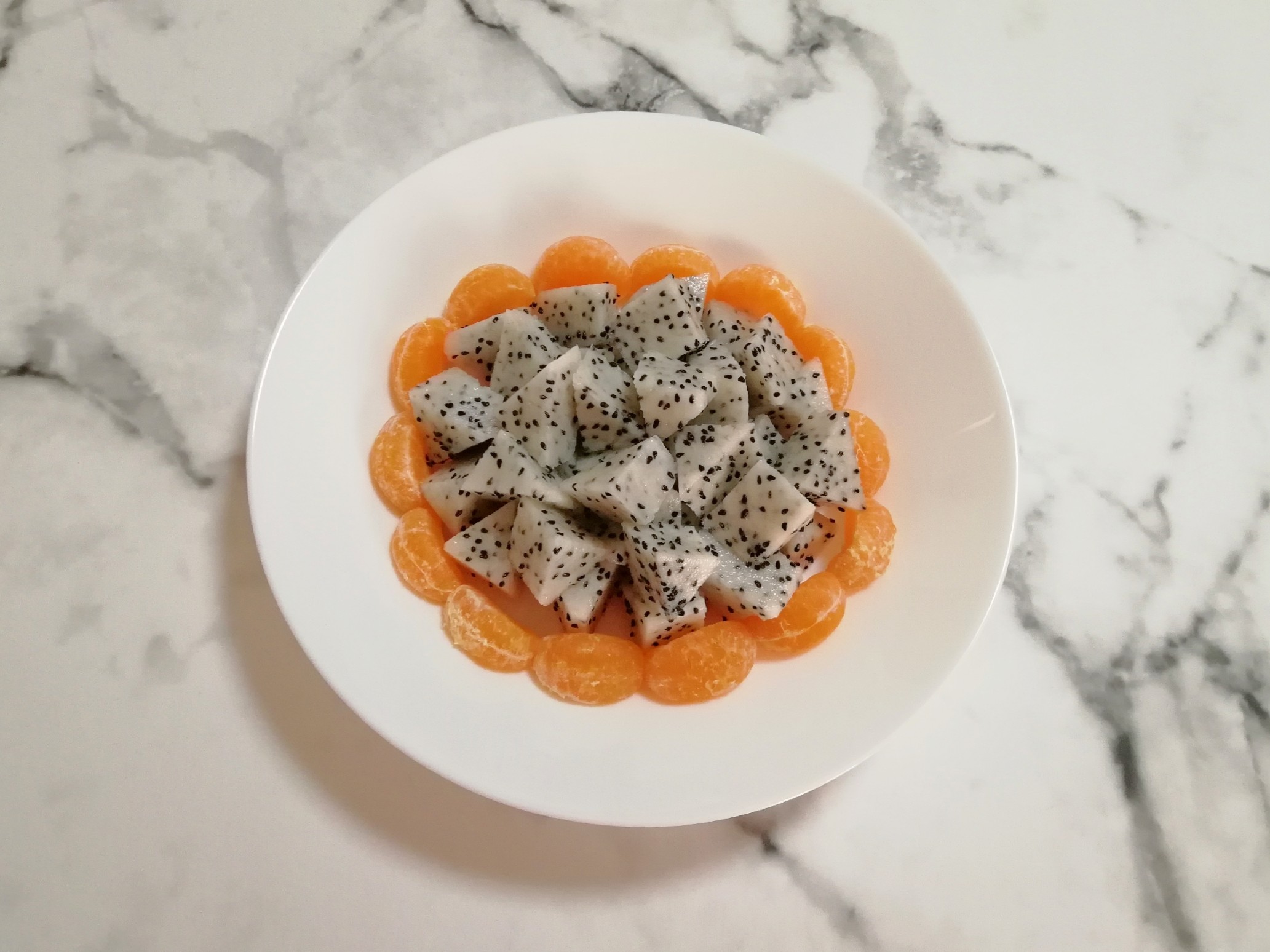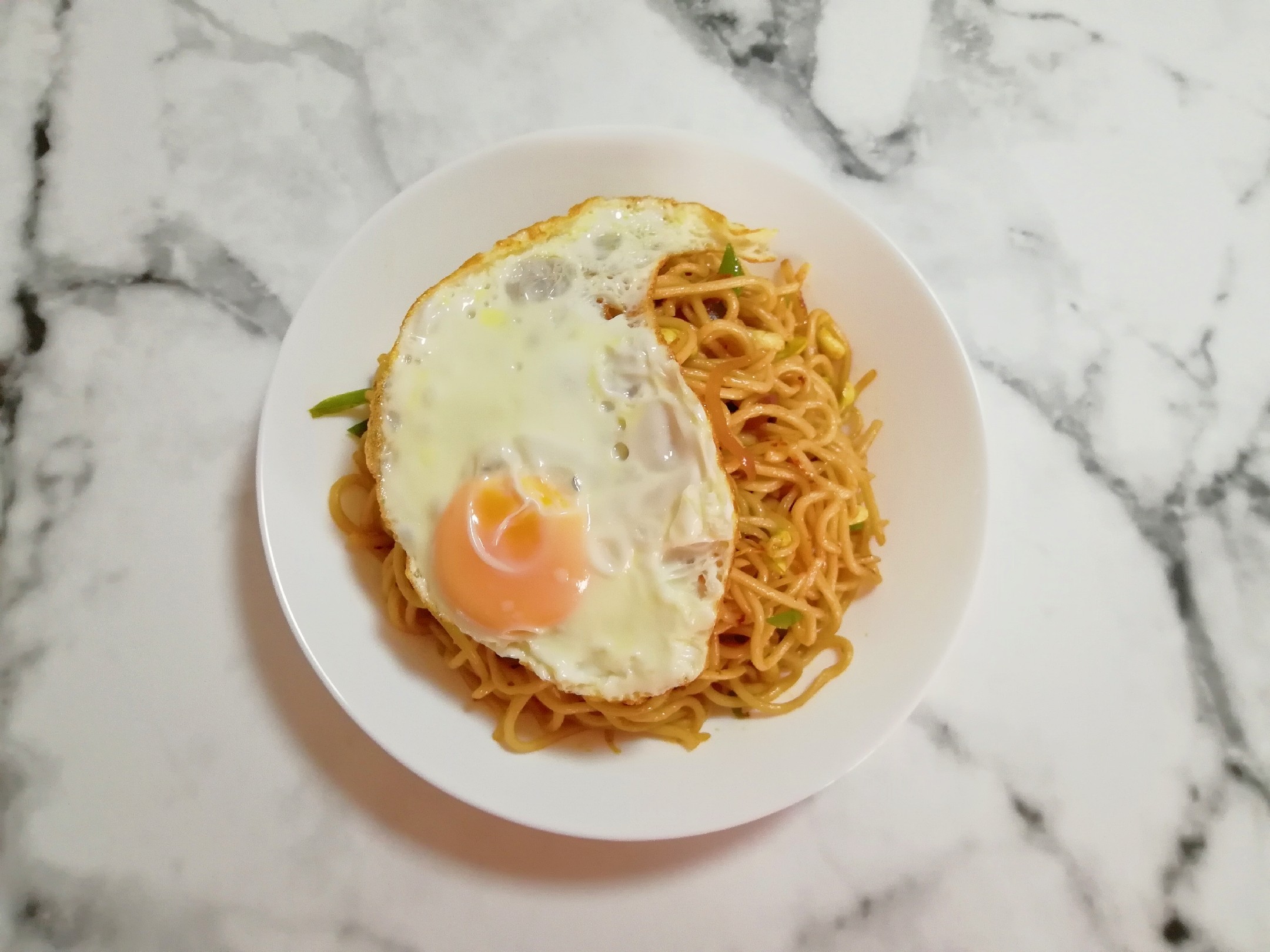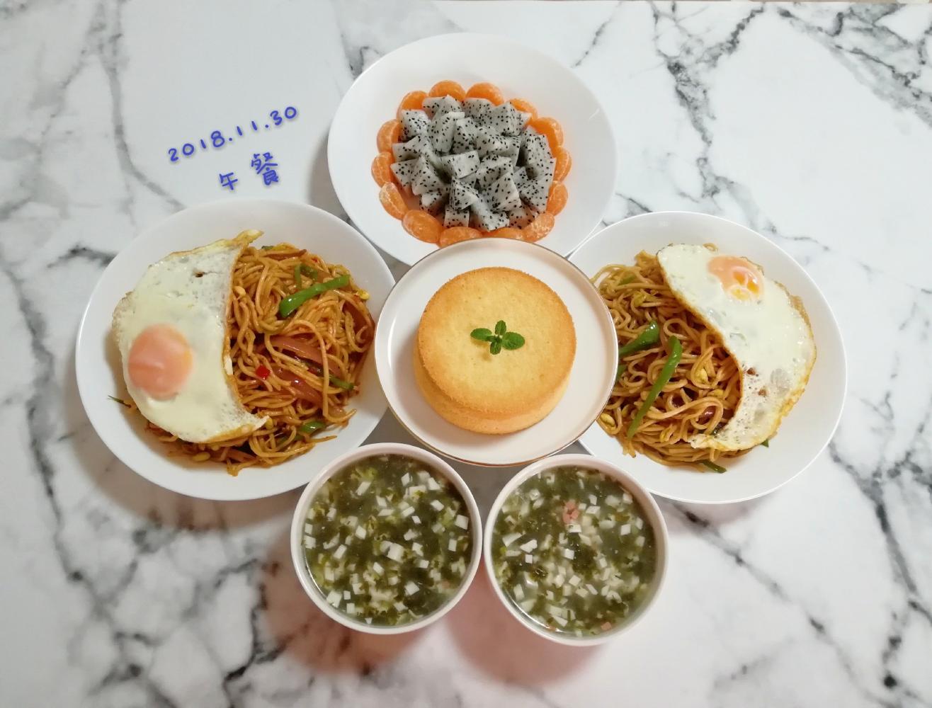 炒面+煎蛋+荠菜豆腐羹+戚风小蛋糕+果盘