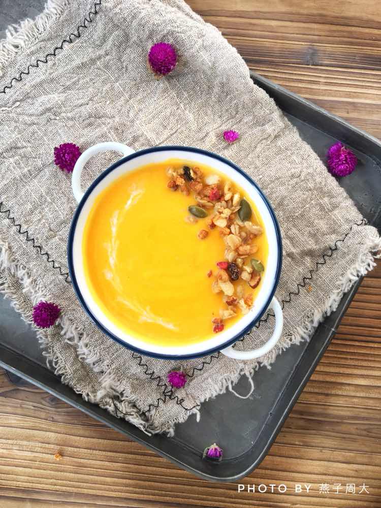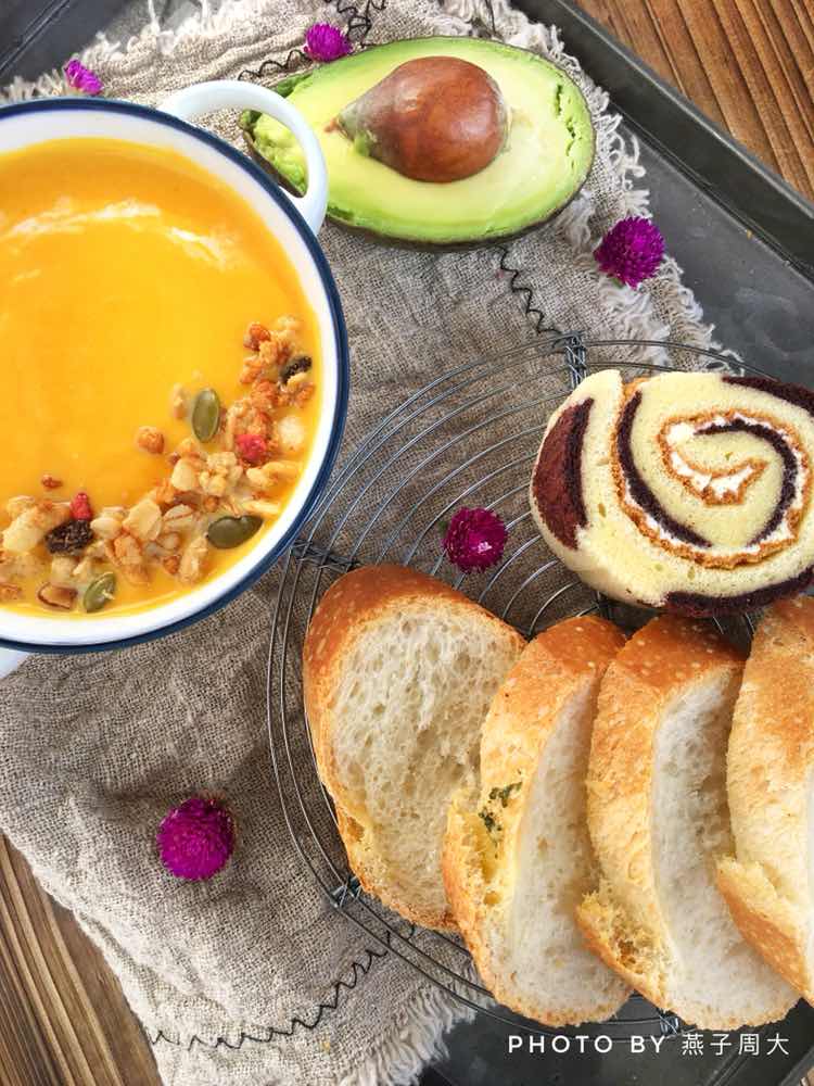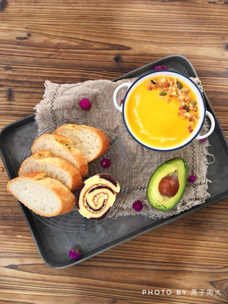 又到周二约饭日,奶油南瓜浓汤配蒜香法棍,第一次尝试真的惊艳到我了,超级好吃,大满足!
