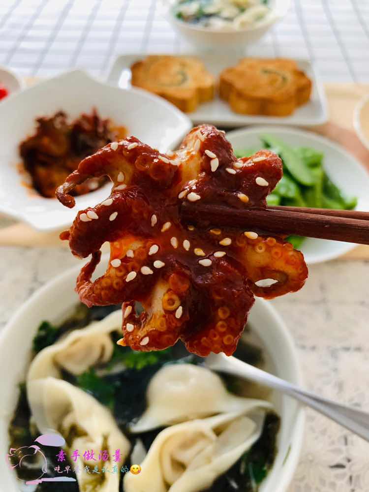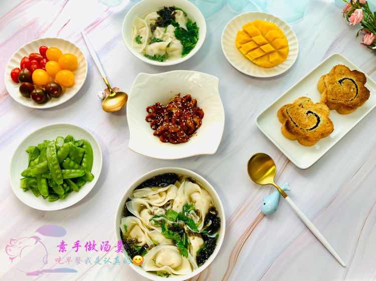 早 生命像一面镜子,对着它皱眉,它回我们皱眉;当我们对它微笑的时候,它回我们微笑! 早餐:猪肉大葱大馅儿馄饨 香辣八爪鱼 海苔梅花吐司 凉拌荷兰豆 小柿子 芒果